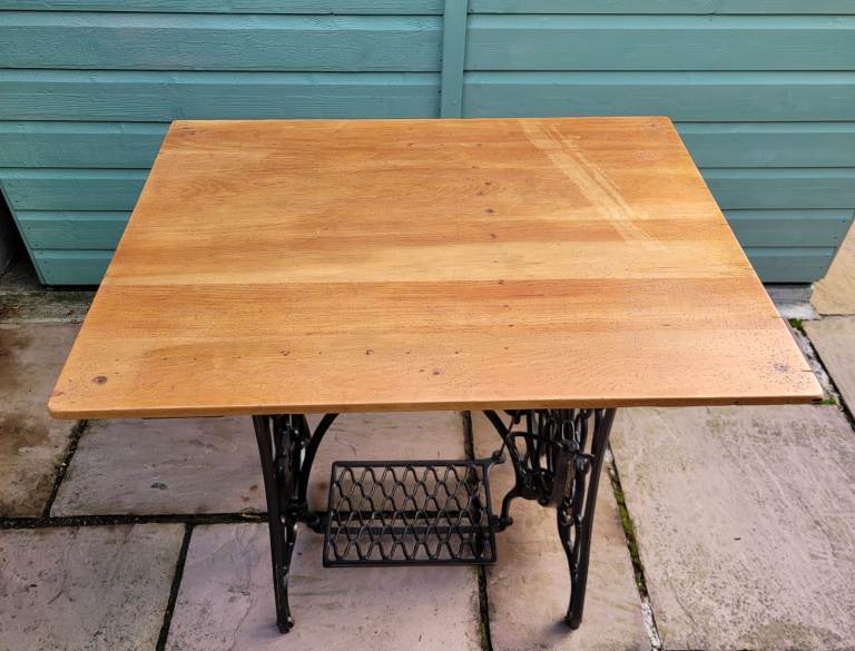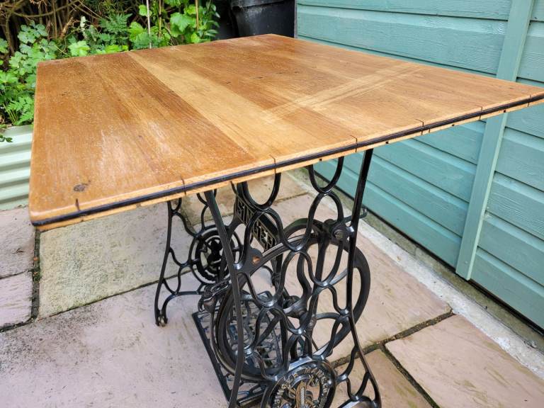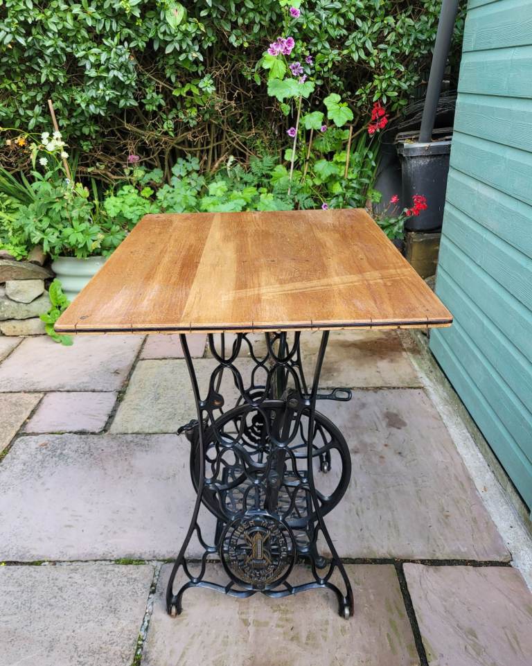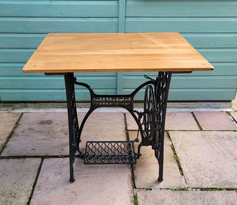 Antique Singer sewing machine treadle base repurposed into table
