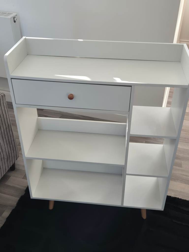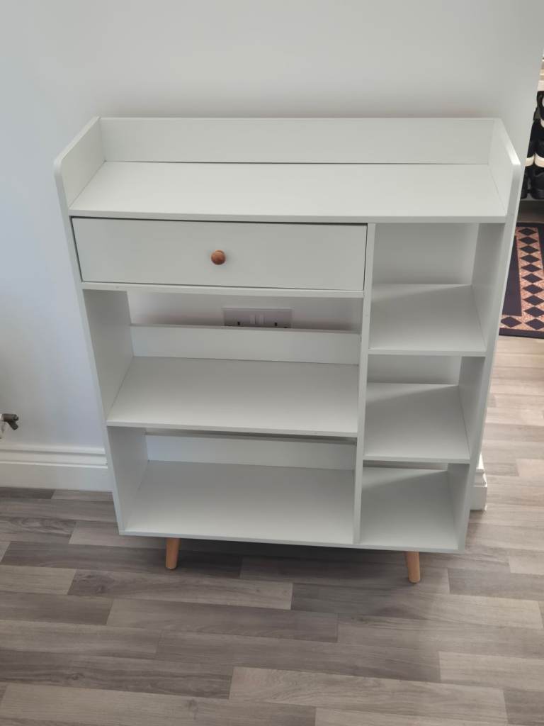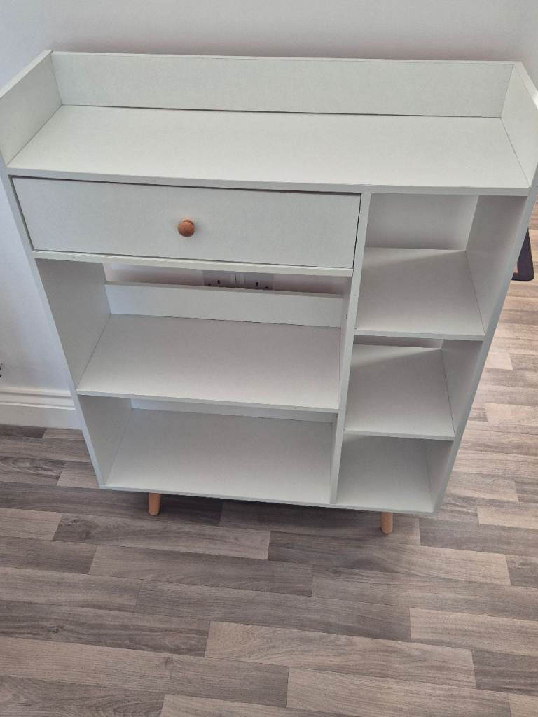 Mutiple shelves and 1 x drawer for storage, with wooden legs as seen photos.
