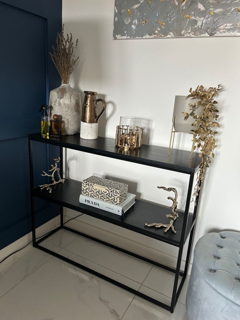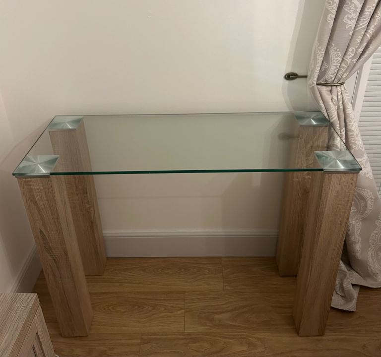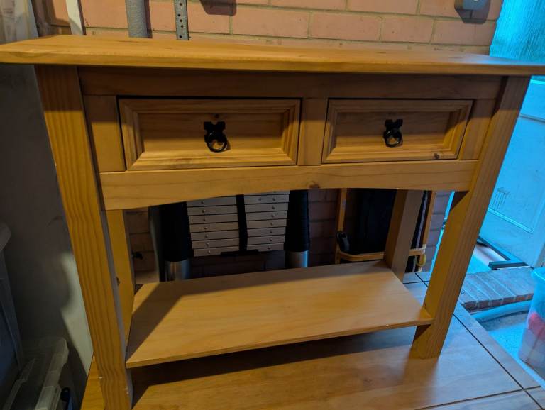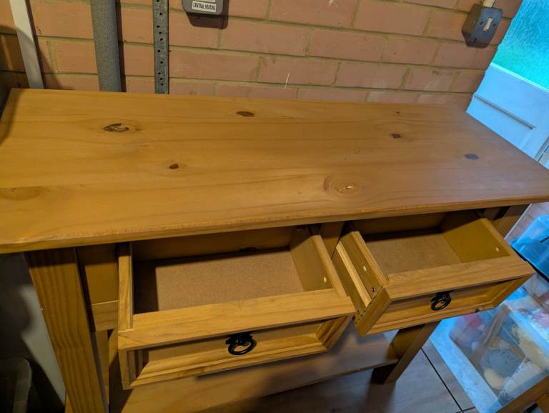 Distressed/waxed pine console table on very good condition. 2 drawers. 90cm wide X 35cm wide X 73cm high.