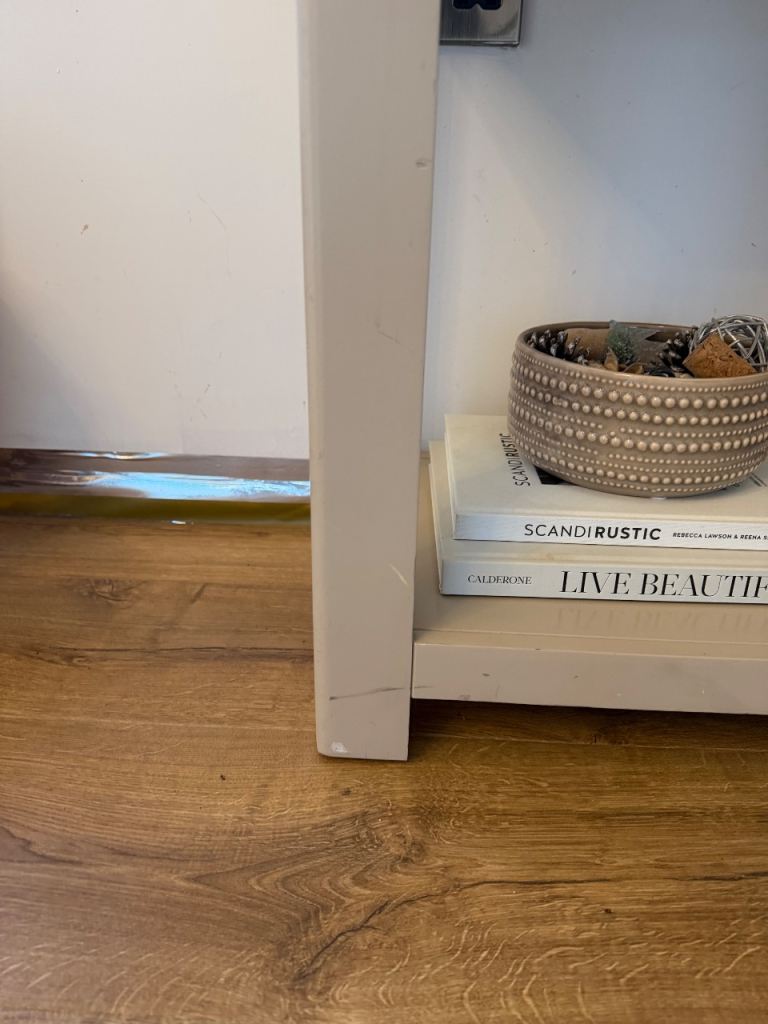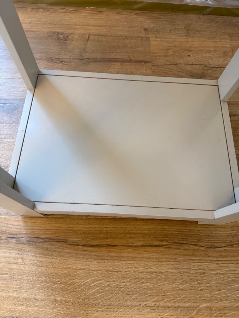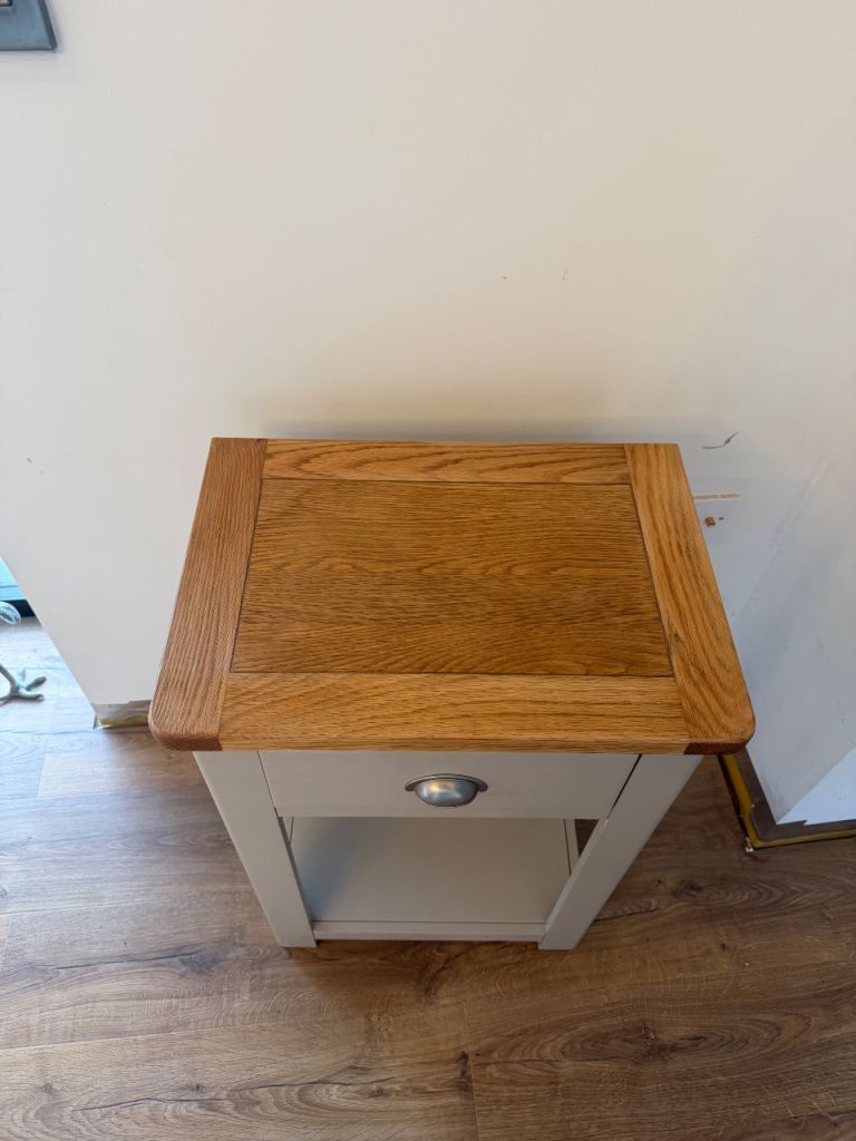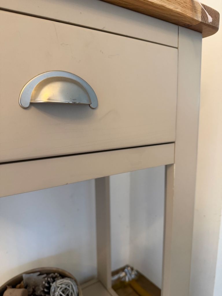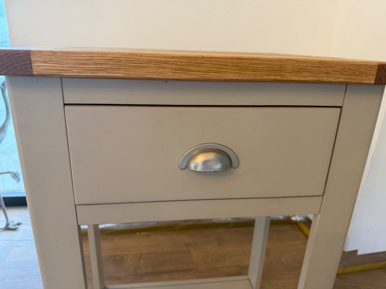 Has signs of wear as pictured, but a lovely piece! Grey in colour with a solid oak top.