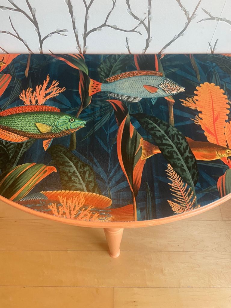 • Top finished in a bold, statement wallpaper in blue, green and orange hues