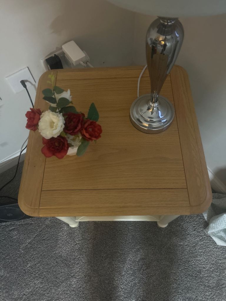 Cream and wood dude table with shelf under. Hardly used.