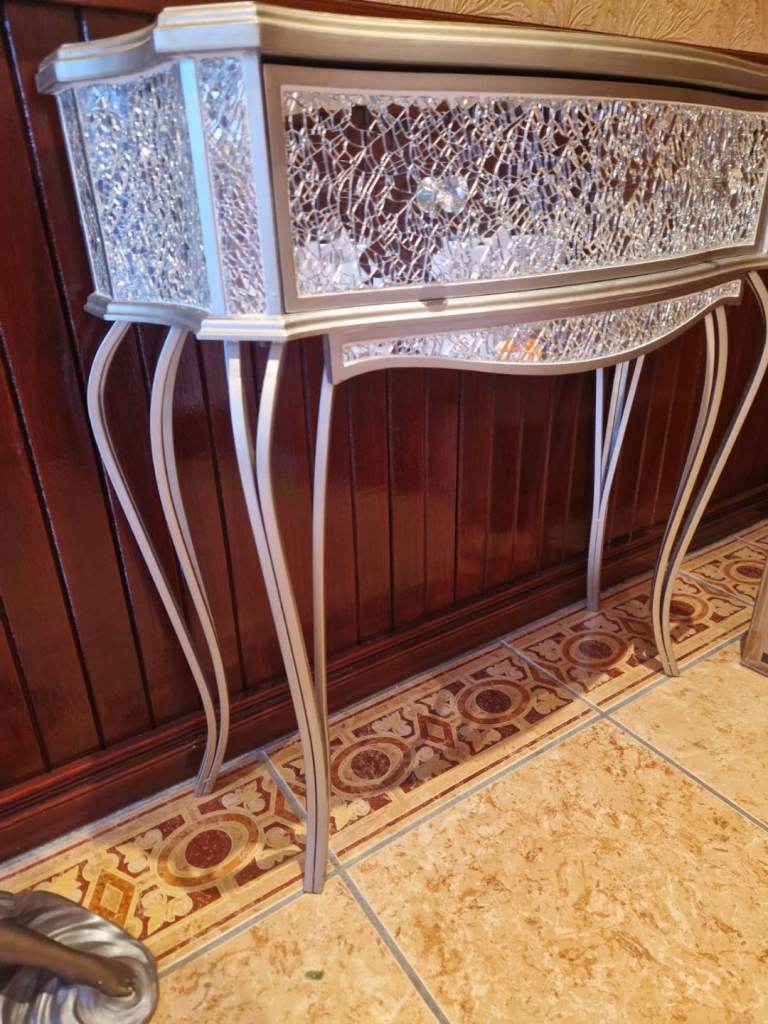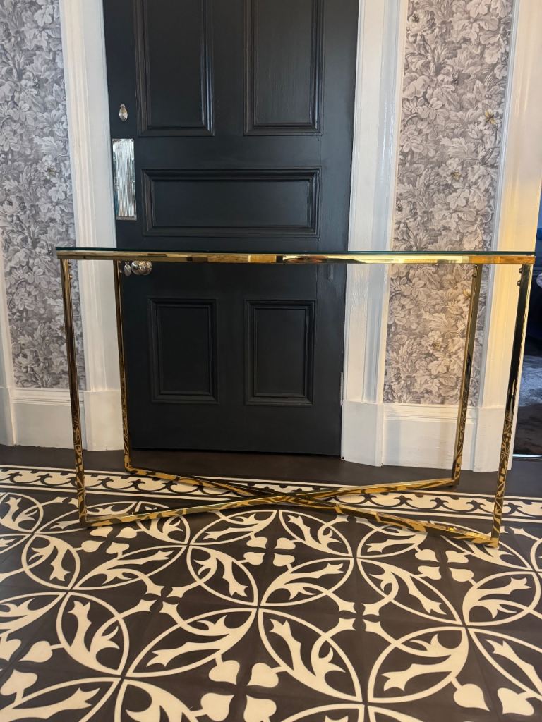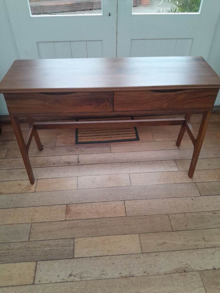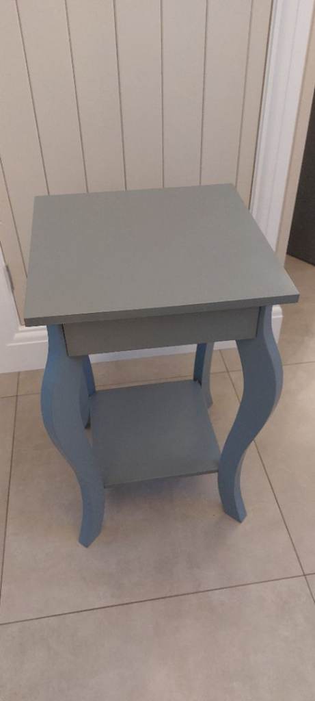 Very good condition, grey wooden console or side table. Has been used as a lamp stand. 60cm high, top is 38cm x 38cm