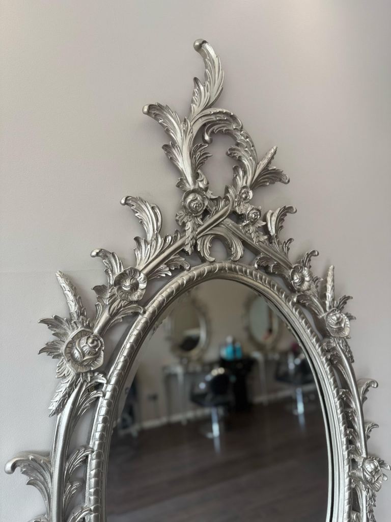 Beautiful luxury console table with matching ornate mirror in elegant silver finish. Features detailed carved design and a classic vintage style that makes it a real statement piece.