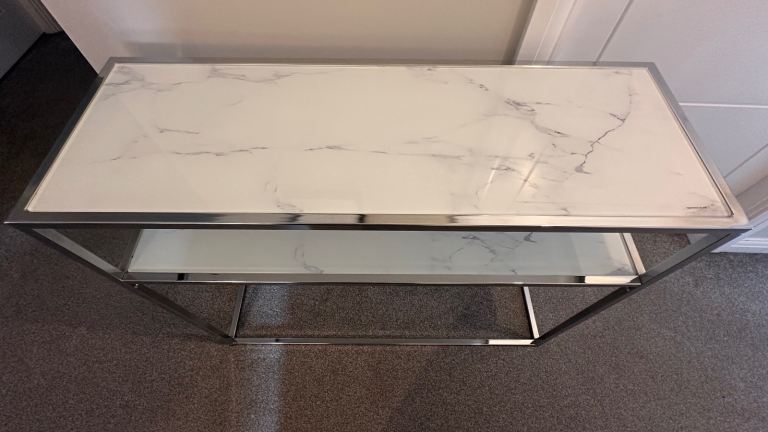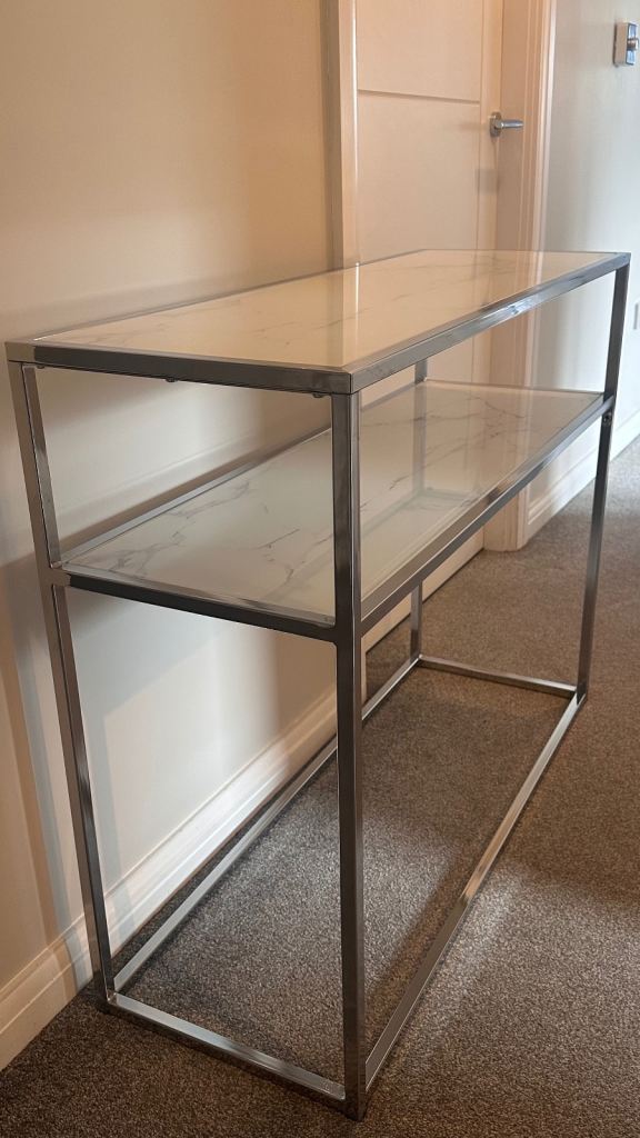 Ex Habitat marble with tempered glass top/chrome console table. 100cm L x 35 cm D x 80 cm . Buyer to collect from Inverness.
