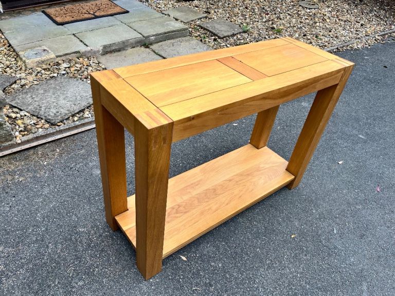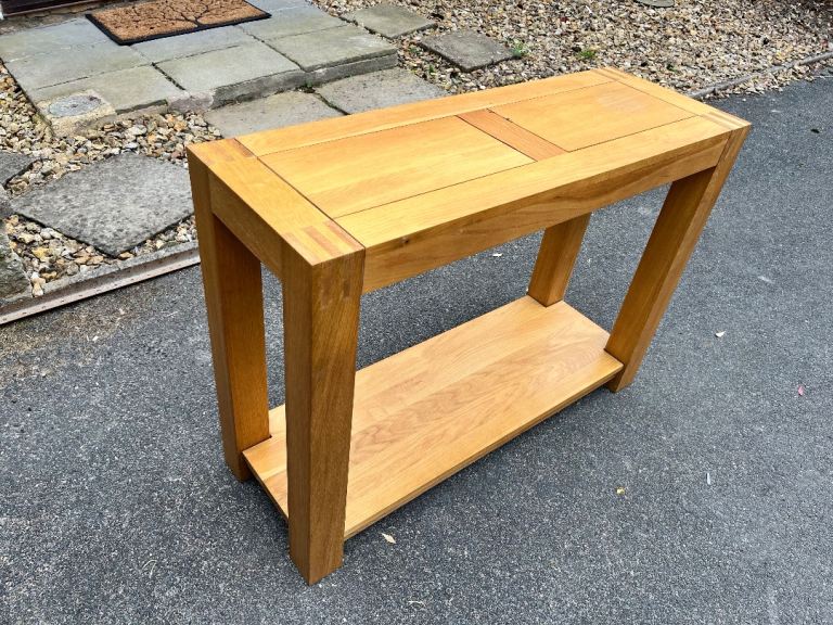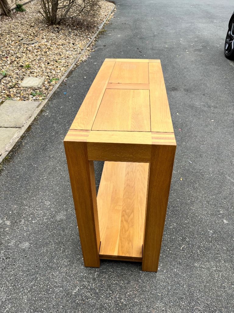 Oak console table, in satin finish. Slight markings to top and faded circle where dish was placed in sunny room. Otherwise, in nice condition with feature exposed mitred joints. Width - 108cm, height - 78cm, depth - 38cm.