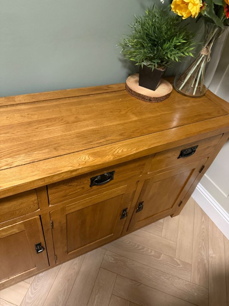 Beautiful solid oak sideboard from Oak Furniture Land in excellent condition. Features quality dovetail joinery, three drawers with metal drop handles, and three cupboards with internal storage.