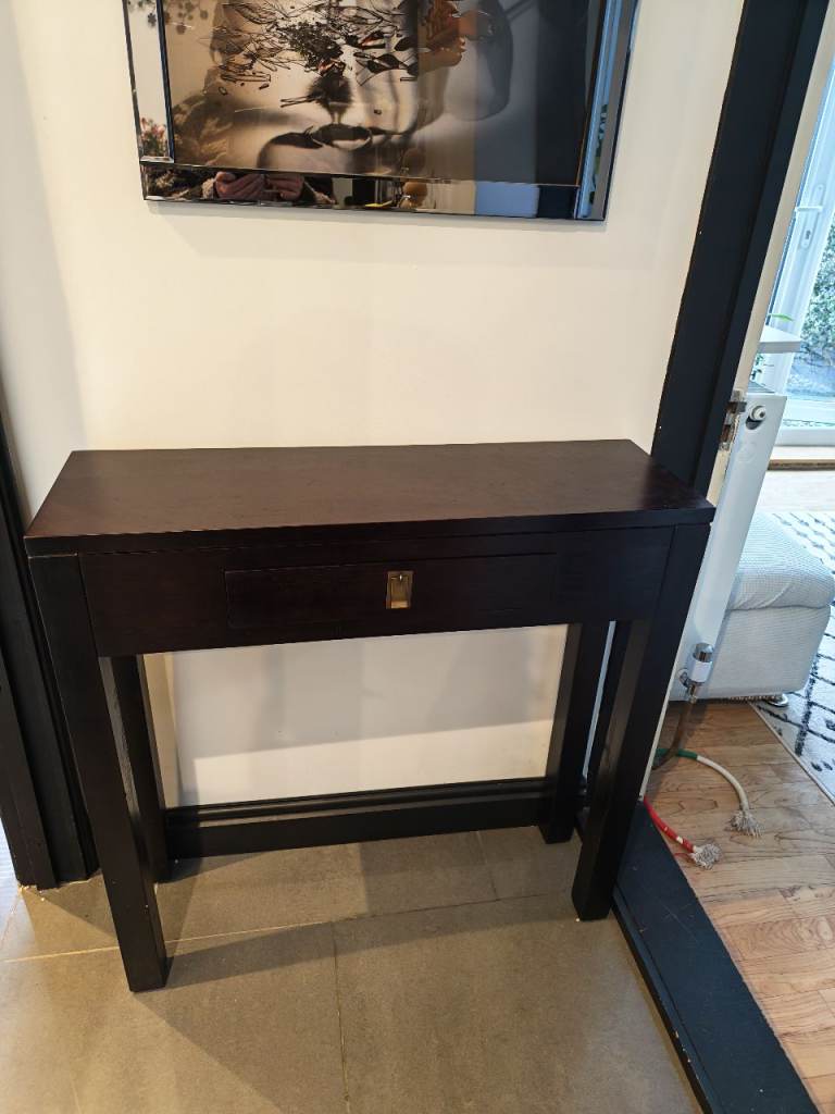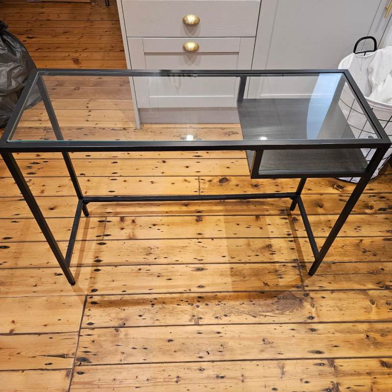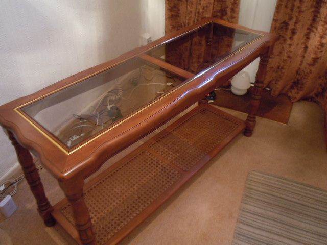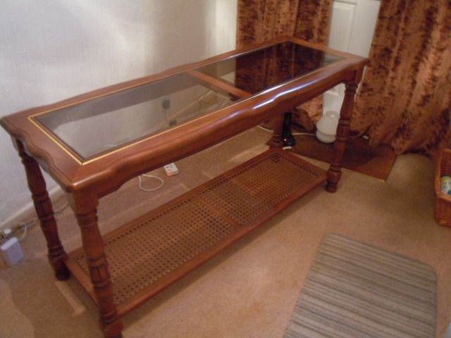 Late 1970s Two Tier Console Sofa or Entrance Table. Possibly walnut. Glass top and cane lower shelf. Approx measurements L 133cm, D 47cm, H 68cm. In good condition. Buyer collects, cash only. £75 ono