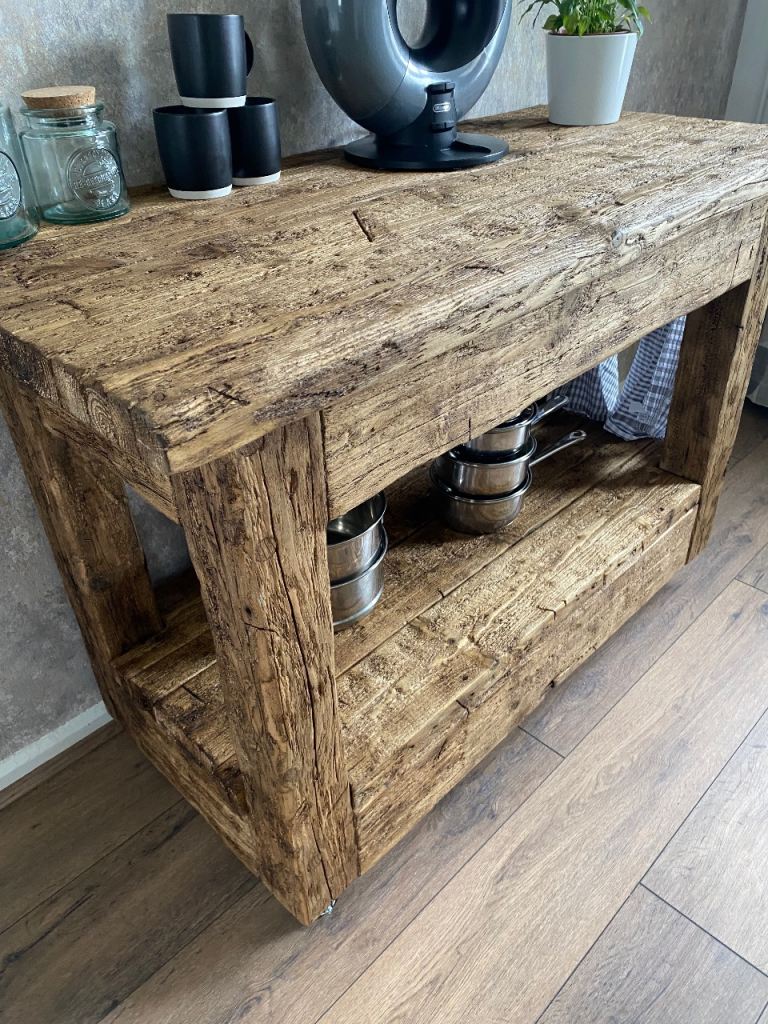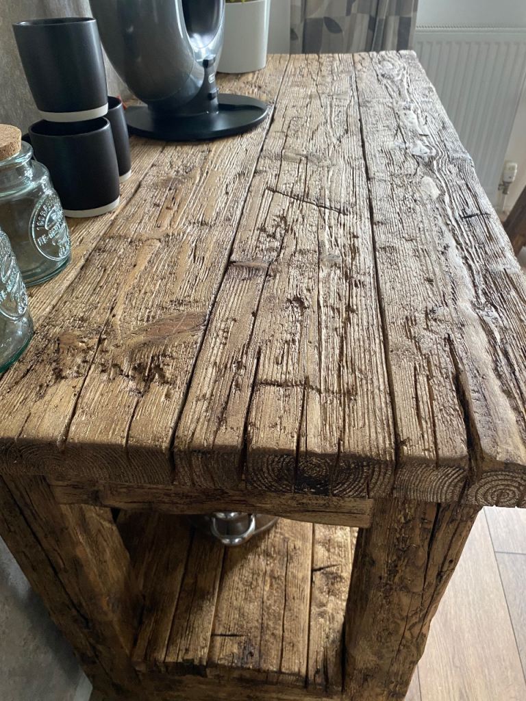 Solid, heavy console table made from reclaimed wood, perfect as a kitchen island.