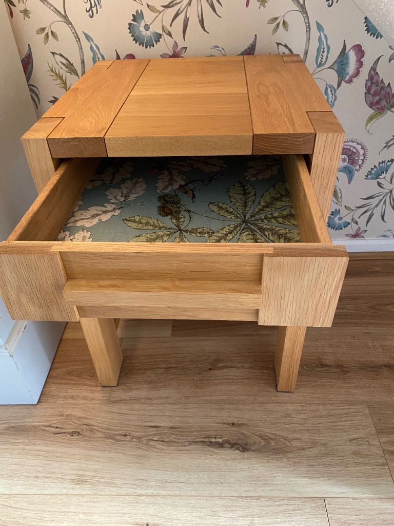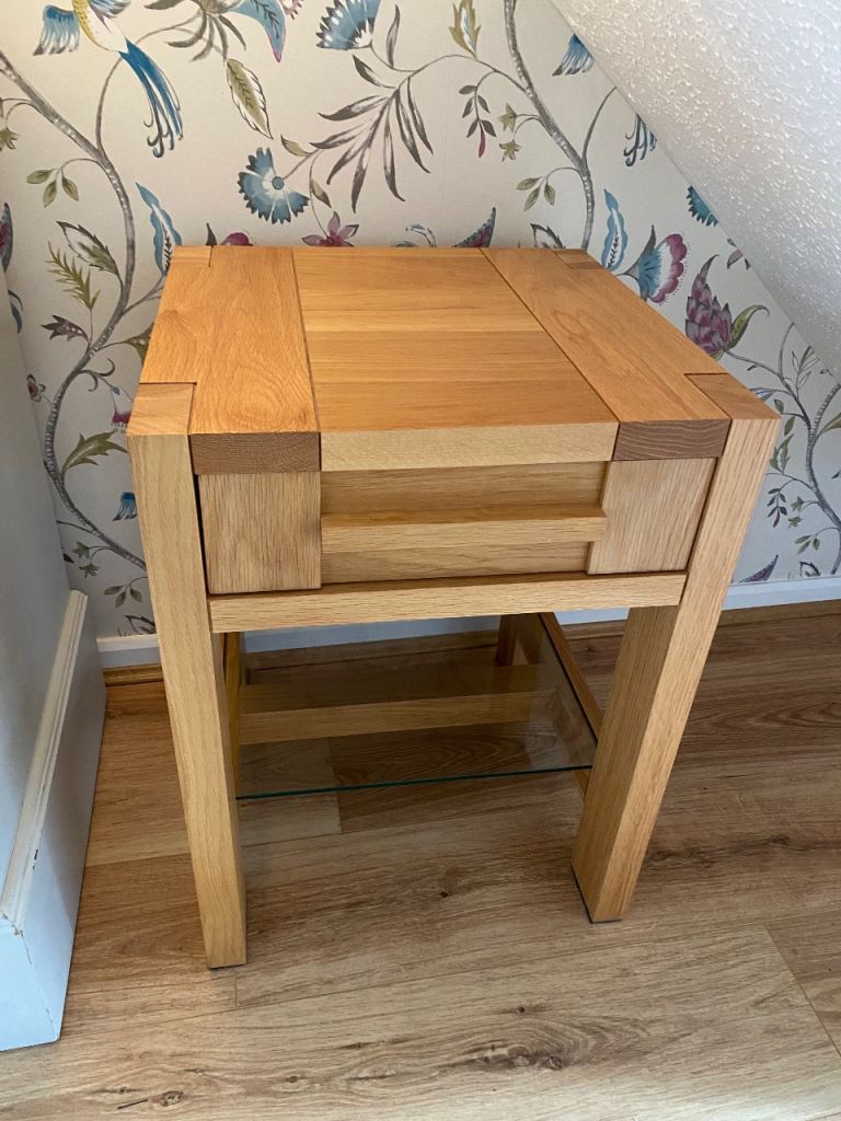 Sonoma side table from Marks and Spencer ,Made of solid oak,mdf and Oak veneers .Height 60cm ,width 44.8 cm,depth 44.8cm with lower glass shelve and drawer.