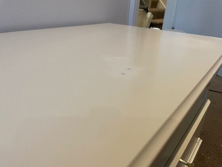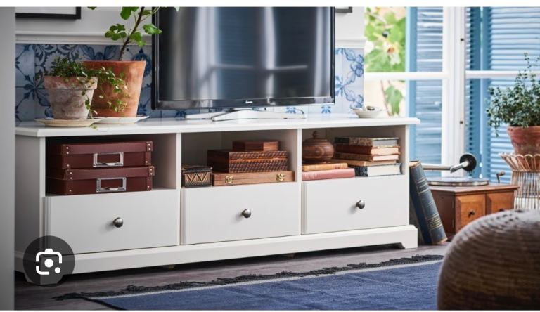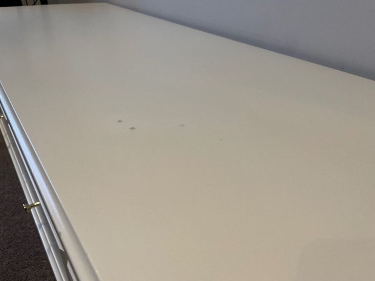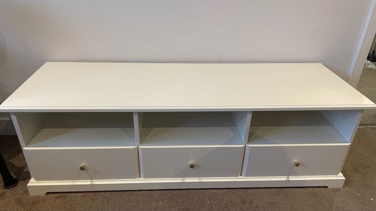 White wooden console/sideboard with 3 cubby holes and 3 drawers. From IKEA originally - LIATORP. Drawers have elegant gold knobs. There are a few scuff marks on the top as pictured though still a lovely and functional piece of furniture. Could be repainted if you wanted. The last picture is not of the actual item we are selling but is an online image of the product.