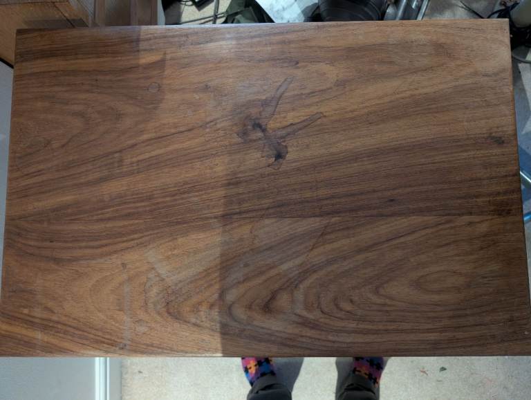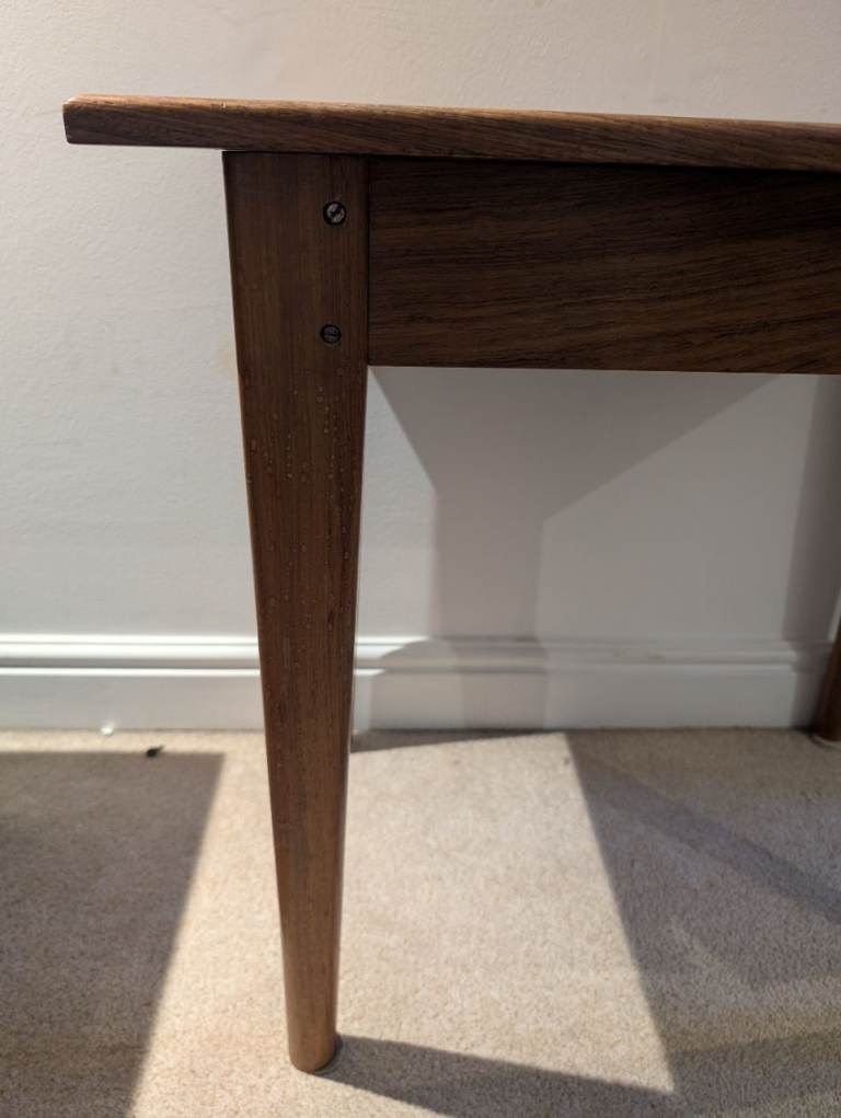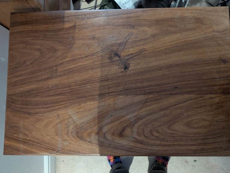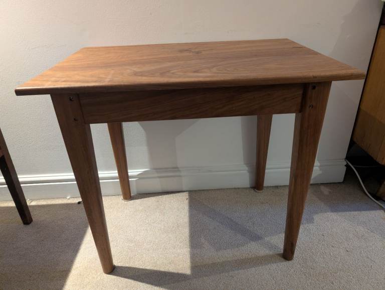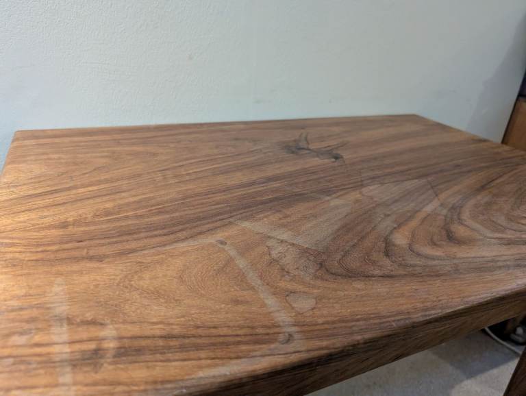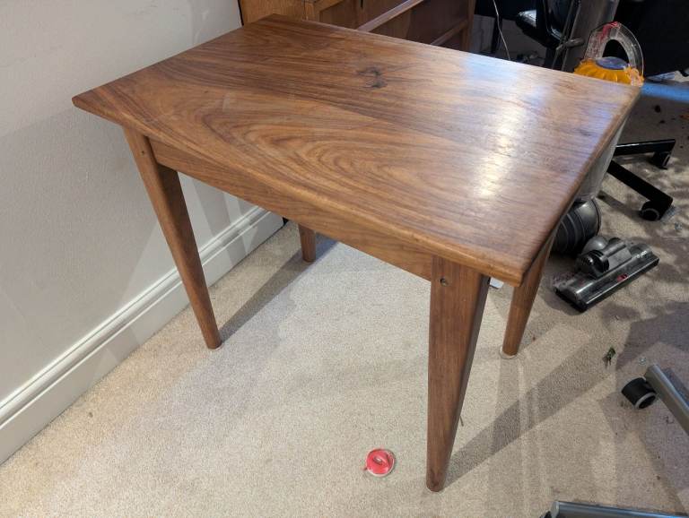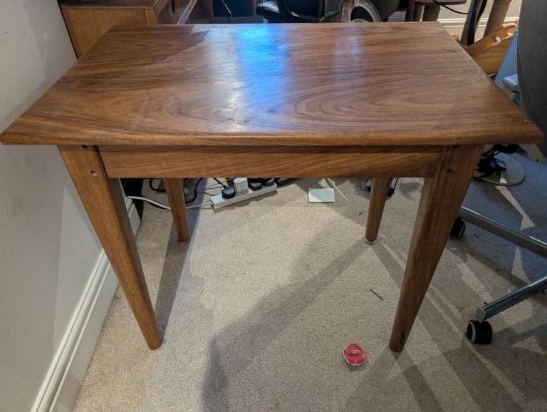 Really pretty solid teak table. it's very plain but sturdy. Its gathered some marks to the finish that are pictured. It would benefit from being redone, but I haven't had time.