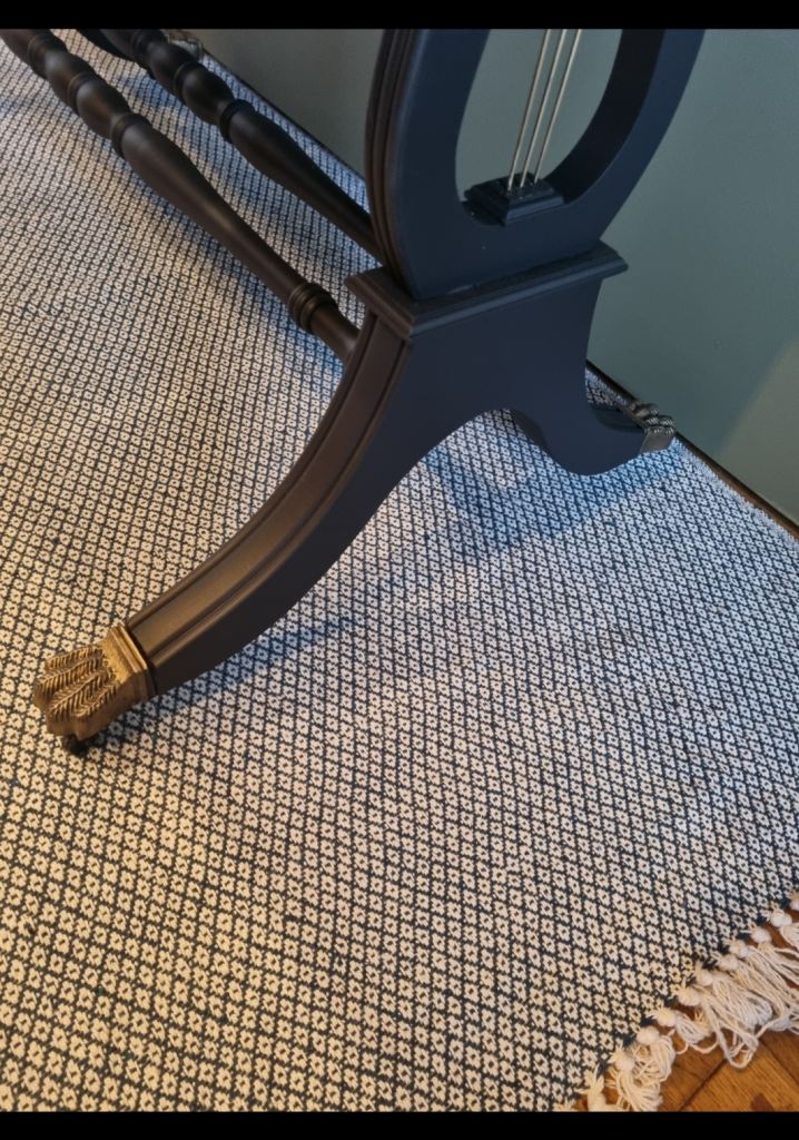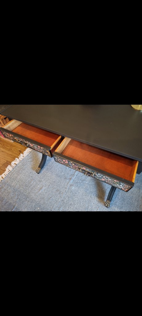Beautiful refinished vintage table featuring a deep black finish and charming floral drawer fronts. This piece has two drawers for storage and drop-leaf sides that fold up to give you extra surface space when needed.
