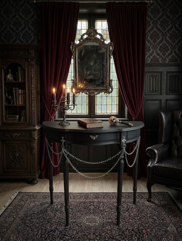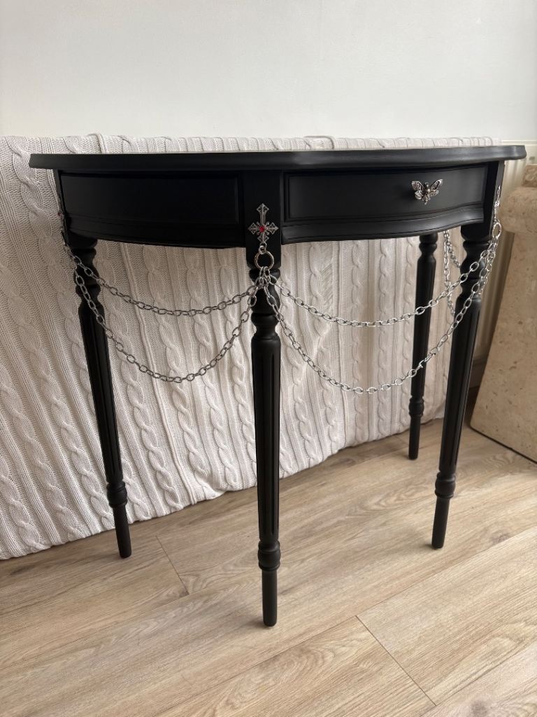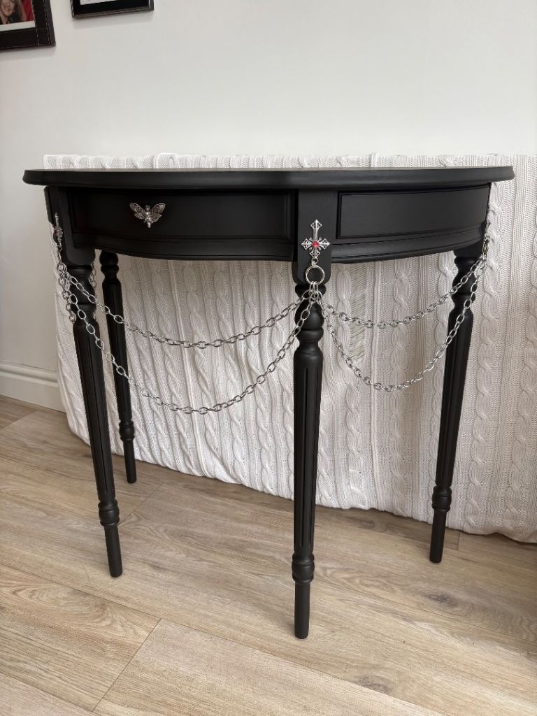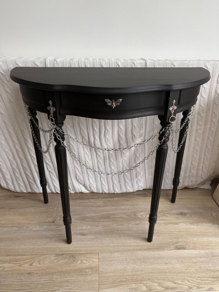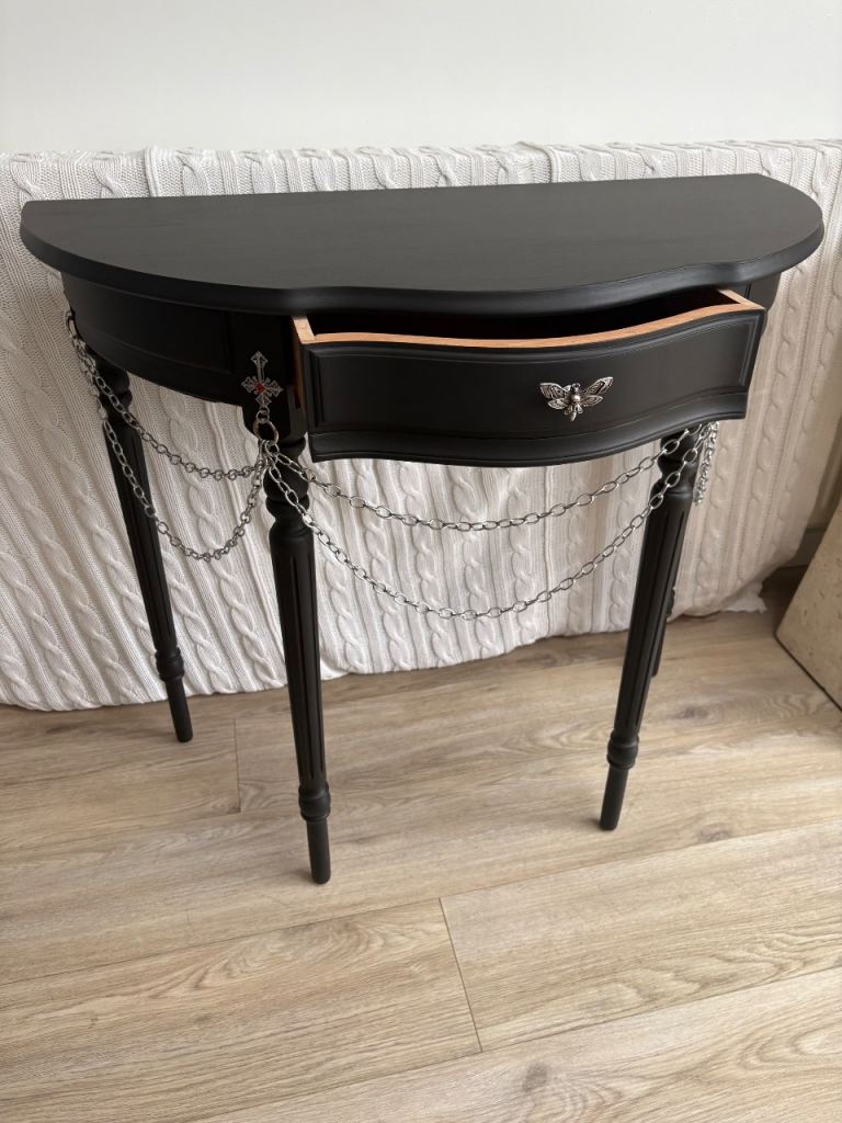 This tall elegant half-moon gothic console table is vintage and has 1 front drawer. It has been upcycled and refurbished using premium matt black paint and gothic crosses and chains and a unique gothic moth drawer puller. This is a completely one of a kind, original, never seen before statement piece. Give your gothic room/house a wow moment! Perfect for a hallway, living room or bedroom. (Open to reasonable offers).