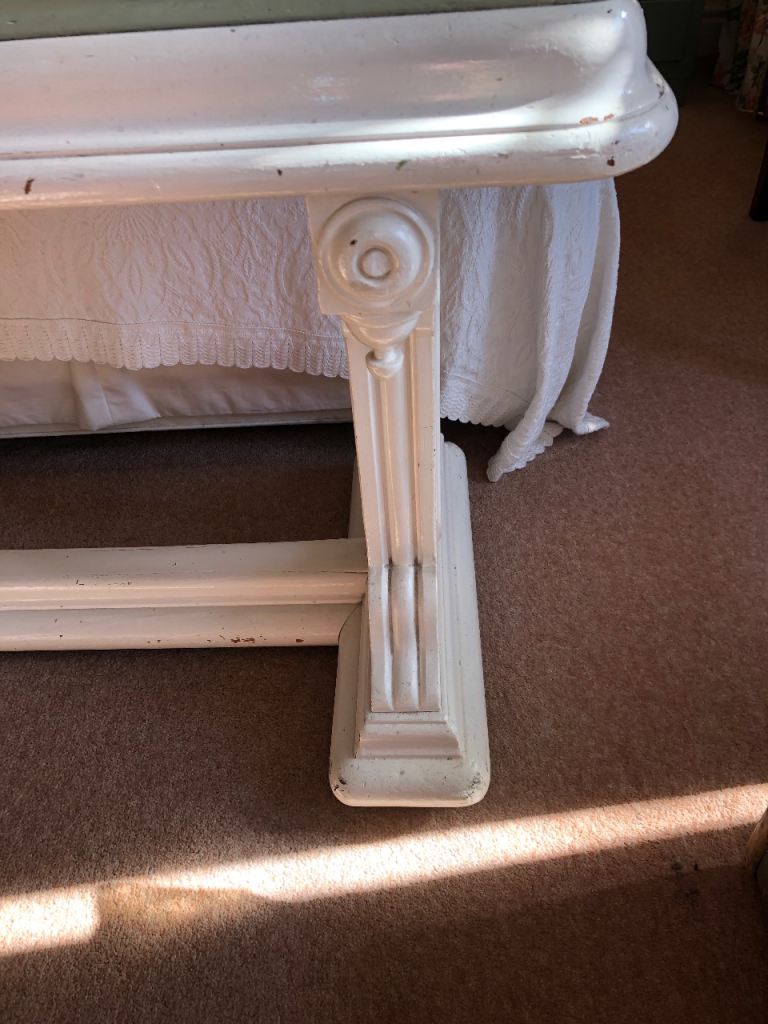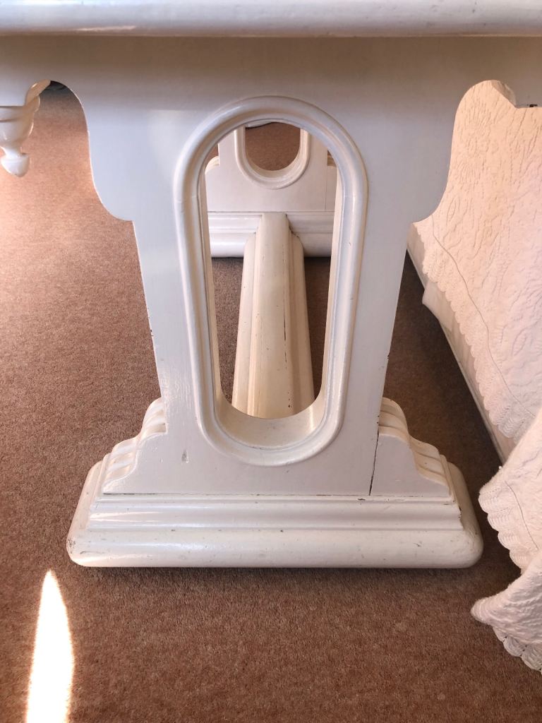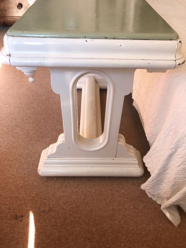 Vintage painted wooden table with decorative trestle base and scroll details.