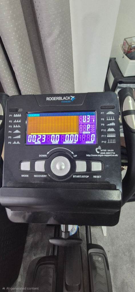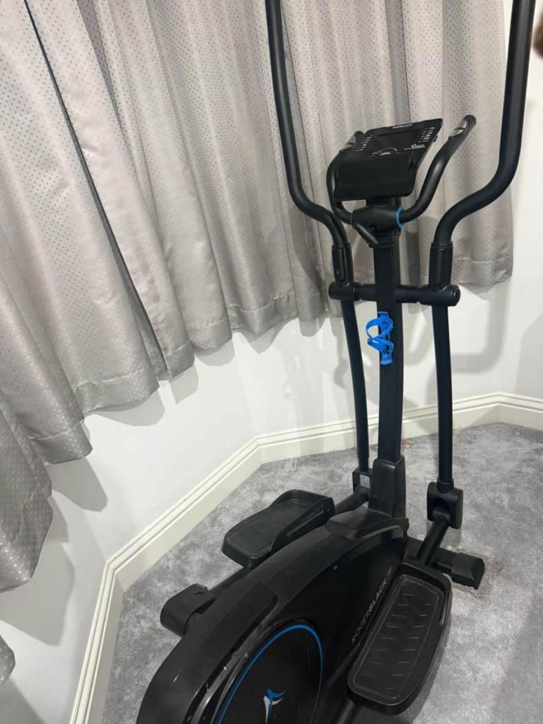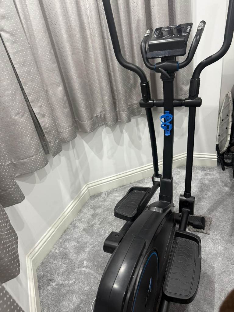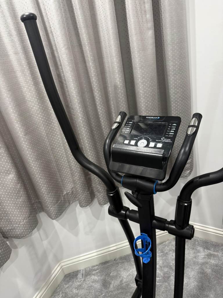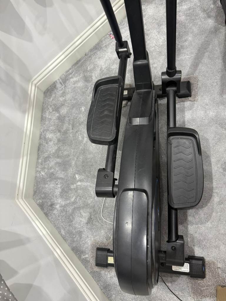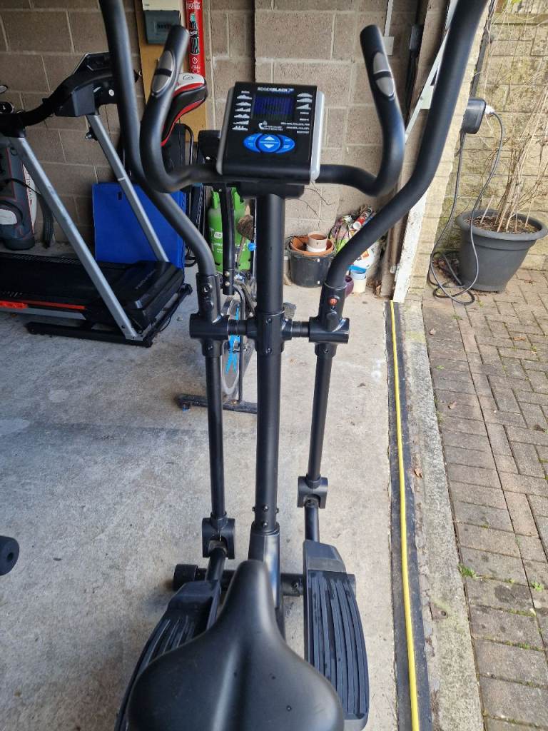 Selling a black cross trainer / elliptical machine in good used condition. It has a sturdy frame, moving handlebars, large foot pedals, and a digital display console for tracking your workout.