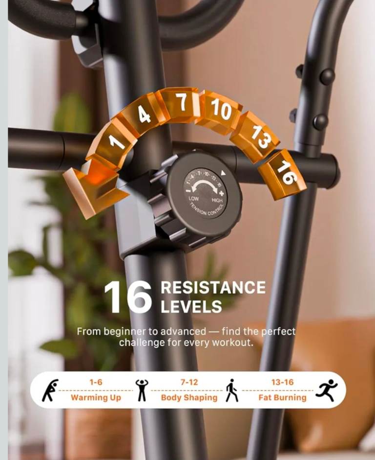 16 Adjustable Resistance Levels: Featuring 16 manually adjustable resistance levels, this cross trainer for home suits beginners through to advanced users. Easily customise your workout intensity and enjoy smooth, low-impact exercise that protects your joints while helping improve endurance and strength.