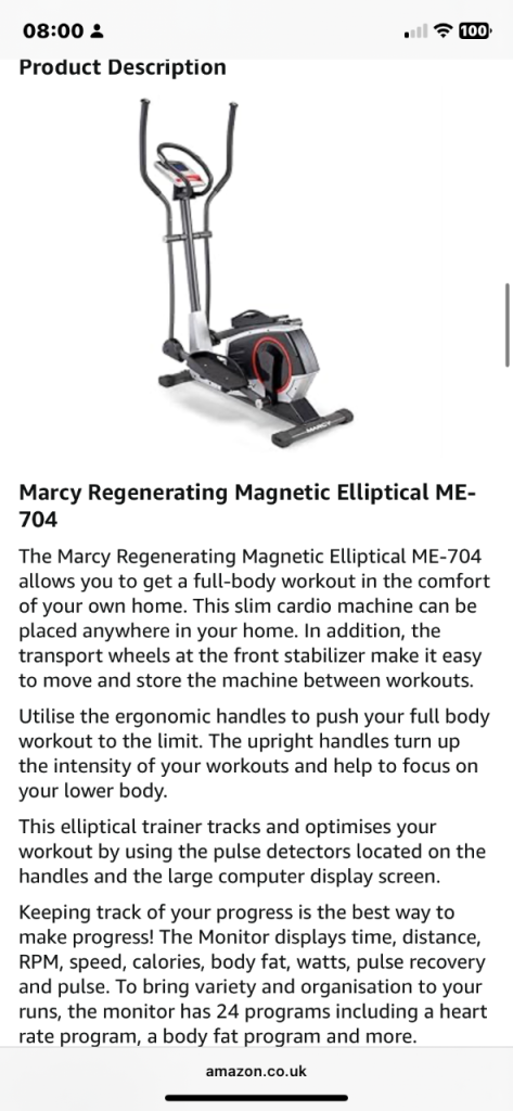 It features 24 programmes. The Monitor displays time, distance, RPM, speed, calories, body fat, watts, pulse recovery and pulse.