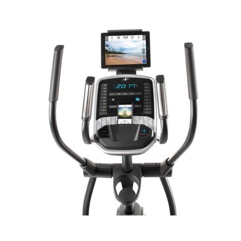 Built with a powerful front drive system, a 48cm adjustable stride length and a 7kg effective inertia enhanced flywheel, the NordicTrack E8.2 Elliptical is a wise choice for your at-home cardio workouts. SMR™ silent magnetic resistance allows for smooth changes between the 20 resistance levels, which are easily adjustable via digital quick controls. 20 pre-set workout apps ensure every workout is varied, keeping you entertained, and your body guessing. Add extra difficulty to your training with the adjustable ramp, changing the incline from 0 to 20° across 5 positions. Oversized levellers, oversized pedals and soft touch upper body grips mean comfort is no issue as you’re working up a sweat. iFit® Bluetooth smart (BLE) enabled, you can access a library of workouts to really get the most out of the E8.2. Automatically track your progress, replicate real-life runs with Google Maps™, compete with your friends and custom-tailor your training to your specific goals (30 Day iFIT Family Subscription Included*). A 5” high contrast multi-colour display lets you easily keep track of your essential workout data, including heart rate readings measured by the EKG contacts positioned on the handlebars. Listen to your own tunes with iPod compatibility (2x 2” speakers), and keep up with your favourite shows thanks to the integrated tablet holder. Other features include a water bottle holder, and front mounted transport wheels for easy movement and storage.