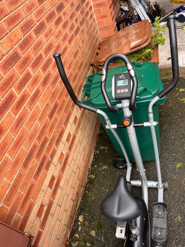 This versatile V-fit exercise machine combines an exercise bike and elliptical for a comprehensive workout. Featuring adjustable tension control and an easy-to-read digital display, it is perfect for home gyms. This used equipment is in good condition, making it an economical choice for fitness enthusiasts.