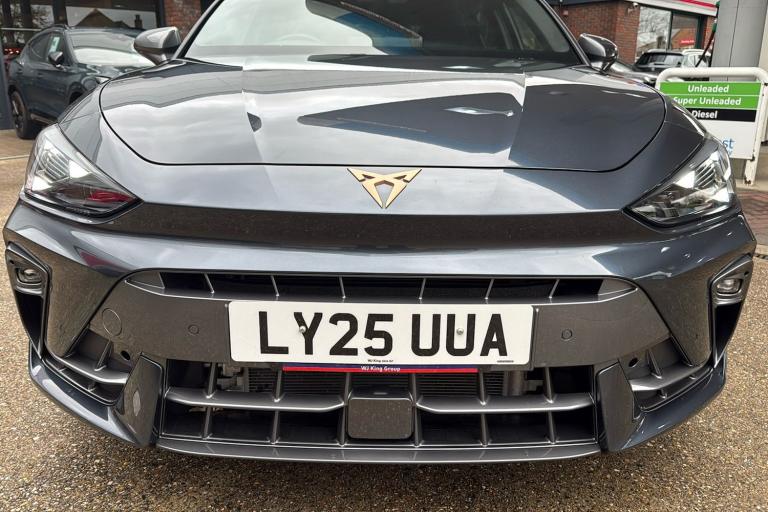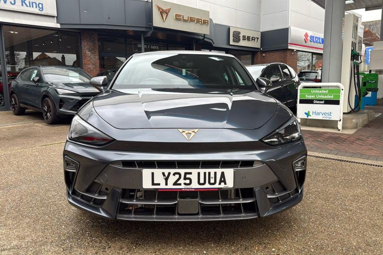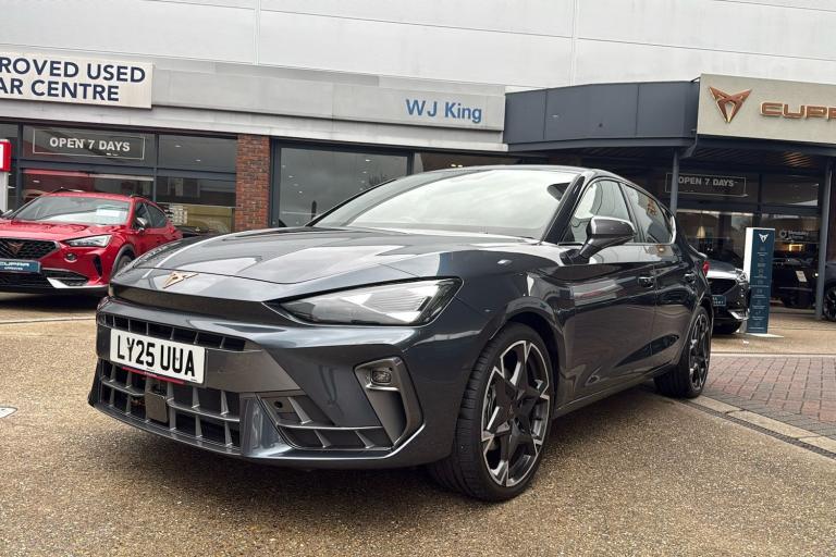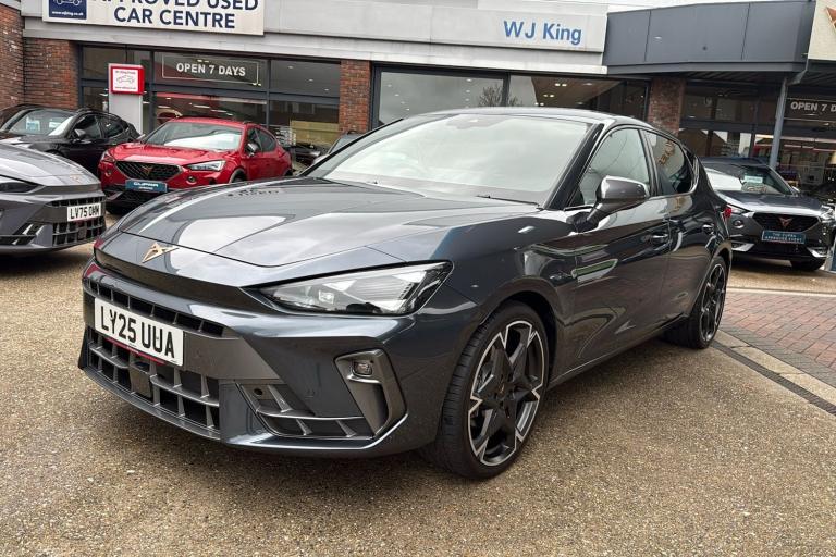 Introducing the 2025 Cupra Leon V2 a stylish five-door hatchback in sleek grey offering an engaging drive with its mild hybrid technology and automatic transmission. This front wheel drive model perfectly balances spirited performance and efficiency delivering up to 53.3 mpg combined and a maximum speed of 134 mph. Its thoughtfully designed interior comfortably seats five and provides a generous 380-litre boot space for your everyday needs. Advanced assistance features a digital cockpit integrated navigation and wireless phone charging are all included to enhance your journey. The distinctive CUPRA design elements including bold exterior styling and ambient interior lighting set this vehicle apart. The Cupra Leon V2 is ULEZ compliant ensuring you can drive confidently in low emission zones. This used 2024 model offers the latest in contemporary comfort and innovation making it an excellent choice for those who value performance and practicality.