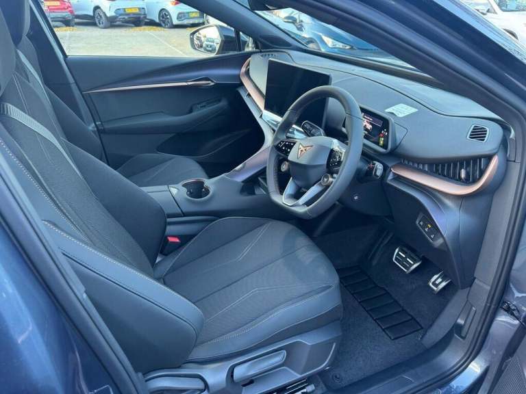This 2025 CUPRA Tavascan V1 is a CUPRA manufacturer approved electric vehicle with a full service history, most recently serviced on 28th October 2025, and comes with a 60 month warranty and 12 months MOT provided on purchase. This electric SUV boasts a substantial 82 kWh battery, offering a maximum range of 353 miles when new, making it ideal for both daily commutes and longer journeys. Key features include Side Assist with Blind Spot Assistance, a preparation for a tow hook including a towbar, and three zone Climatronic air conditioning for ultimate comfort.Experience convenience with Keyless Entry and Go, and keep your devices powered up with the integrated wireless charger. The Tavascan V1 also offers a large boot space, providing ample room for all your luggage and shopping. While a full charge at home using a 7kW charger takes approximately 39 hours, you can achieve an 80% charge from empty in just 32 minutes at a public charging station, demonstrating its efficiency and suitability for modern electric vehicle ownership.
