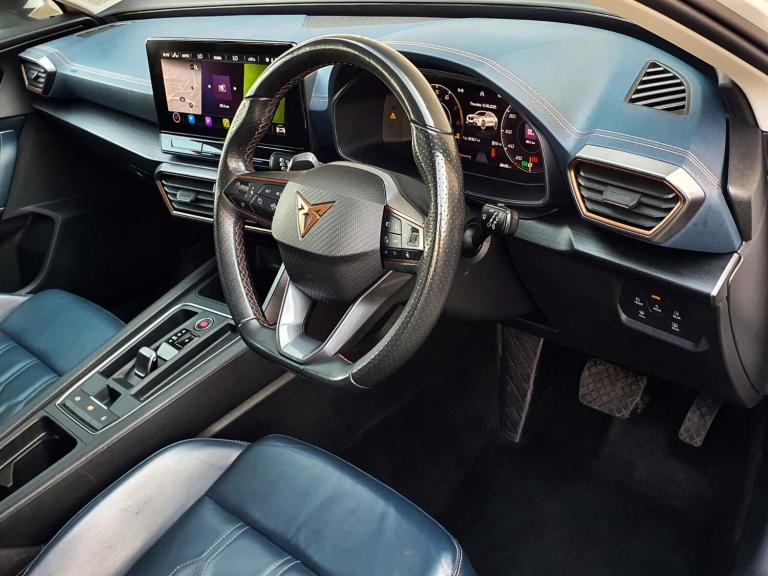 ..Digital cockpit and configurable dashboard, Driver alert system, Driving profile selection, E-call, Forward collision warning with automatic braking, Lane assist, Park assist (inc front/rear parking sensors), PAS, Predictive adaptive cruise control with speed limiter, Rear view camera, RPM, trip computer, outside temp gauge, instrument light brightness, low fuel warning light, lights on reminder, gearshift indicator, Service interval indicator, Start/stop system with regenerative braking, Wireless apple carplay, Wireless phone charger, Electronic locking differential and dynamic traction support, Standard suspension, 2 front and 2 rear USB type C sockets, Auxiliary input socket, DAB radio, Auto dimming rear view mirror, Body colour door handles, Body coloured bumpers, Dark grey wing mirror, Daytime running light with automatic headlight control and coming home feature, Dynamic headlight range control, Electric front/rear windows, Electrically adjustable heated and folding door mirrors with memory function, Electrically adjustable, heated and folding door mirrors, Front fog lamps with cornering function, Gloss black roof rails and window surrounds, LED Headlights, LED Taillights with dynamic indicator, Rain sensing wipers, Rear diffuser with black simulated exhaust pipes, Rear side wing doors, Rear wash/wipe, Third brake light, Tinted rear windows, Welcome lights, 12v power supply in centre console, 12V socket, 12v socket in loadspace, 2 front and 2 rear reading lights, 230V socket, 3 seat bench in 2nd row, 60/40 split rear bench seat with armrest and mechanical seat release, Dust/pollen filter, Front and rear head restraints, Front centre armrest, Heated steering wheel, Height/reach adjust steering wheel, Illuminated interior front door sills, Illuminated sunvisor with mirror, Isofix, Leather multi function heated steering wheel with gear shift paddles, Leather multi function steering wheel with gear shift paddles, Luggage tie-down hooks, Single front passenger seat, Three zone climate control with control panel in rear, Variable luggage/load compartment floor, Wraparound lighting, Genuine Nappa leather Pack - Cupra, Navigation system pack with 10'' navigation system - Formentor, 3 point seatbelts on all rear seats, ABS, Brake control system - ESC and brake booster, Child proof door locks, Driver and front passenger airbags with front passenger airbag de-activation, Electronic parking brake, Front and rear disc brakes, Front side curtain airbags, Hill