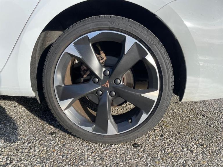 This brand new 2023 Cupra Leon 1.5 Etsi V1 DSG Estate in Metallic Nevada White is a stunning estate car with a sporty edge. With just 31279 miles on the clock, this vehicle is packed with features. It rides on impressive 18"" Machined Sport Black and Silver Alloy Wheels, complemented by Cupra black brake calipers. The interior is equally impressive, featuring ambient lighting, CUPRA leather flat-bottomed steering wheel with gearshift paddles, and a digital cockpit. Safety is a priority with driver and front passenger airbags, lane assist, rear view camera, and front assist with forward collision warning. The vehicle is powered by a powerful yet efficient 1.5L engine, and includes modern conveniences such as wireless phone charging, media system plus with navigation pack, and a tyre pressure monitoring system. This Cupra Leon offers a dynamic driving experience combined with practicality, making it a great choice for those who appreciate performance and style in a versatile estate car.