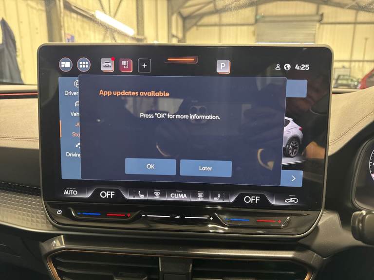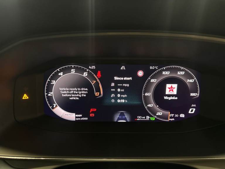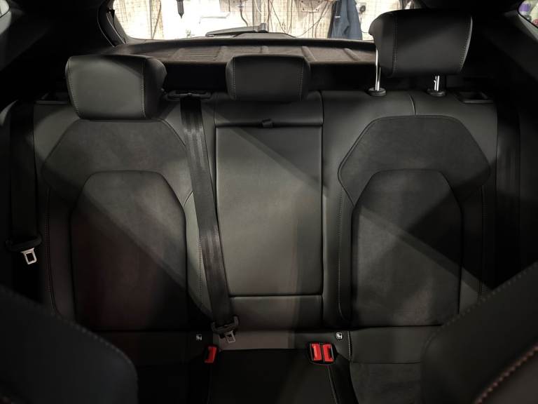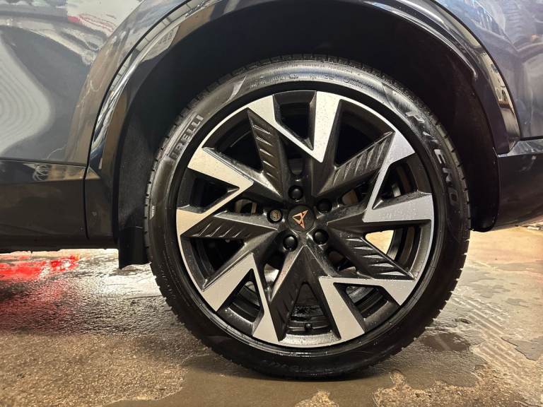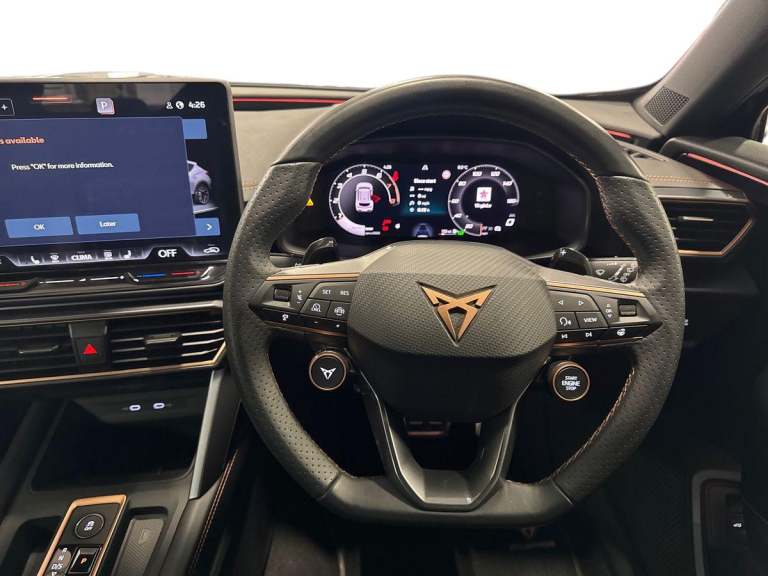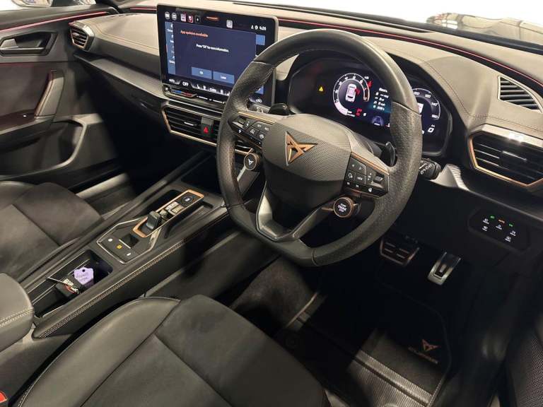 ..10.25'' digital cockpit and configurable dashboard, Adaptive cruise control with follow-to-stop and speed limiter, Advanced driver alert system, Driving profile selection, Dynamic road sign display, Emergency steering support with turn assist, Forward collision warning with automatic braking, Front and rear parking sensors, Full link phone integration, Lane assist, Progressive steering, Rear view camera, RPM, trip computer, outside temp gauge, instrument light brightness, low fuel warning light, lights on reminder, gearshift indicator, Service interval indicator, Start/stop system with regenerative braking, Virtual pedal and electric tailgate, Voice control system, Wired Android Auto, Wireless apple carplay, Wireless phone charger, CUPRA sport suspension, Electronic locking differential and dynamic traction support, 2 front and 2 rear USB type C sockets, Media system with navigation, 12.9'' touchscreen display, voice control, DAB, steering wheel mounted controls, Auto dimming rear view mirror, Body colour door handles, Body coloured bumpers, Dark grey wing mirror, Daytime running light with automatic headlight control and coming home feature, Door panel ambient lighting, Dynamic headlight range control, Electric front/rear windows, Electrically adjustable heated and folding door mirrors with memory function, Gloss black roof rails and window surrounds, High beam assist, LED 3rd brake light, LED front fog lamps with cornering function, LED Headlights, LED Taillights with dynamic indicator, Rain sensing wipers, Rear diffuser with black simulated exhaust pipes, Rear fog lights, Rear side wing doors, Rear wash/wipe, Tinted rear windows, Welcome lights (within exterior mirror housing), 12V socket, 2 front and 2 rear reading lights, 3 seat bench in 2nd row, 60/40 split rear bench seat with armrest and mechanical seat release, Black headlining, Black interior roof lining, Cupra sports pedals, Dust/pollen filter, Electrically adjustable driver's seat with memory and lumbar support, Front and rear head restraints, Front centre armrest, Heated front seats, Heated supersports multifunction leather steering wheel with satellite buttons and gear shift paddles, Height/reach adjust steering wheel, Illuminated aluminium doorsteps, Illuminated interior front door sills, Illuminated sunvisor with mirror, Isofix, Leather dashboard, door insert and side trim panel, LED smart wraparound lighting, PVC/Dinamica microfiber upholstery + bucket seats, Satellite steering wheel,
