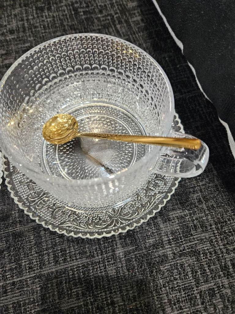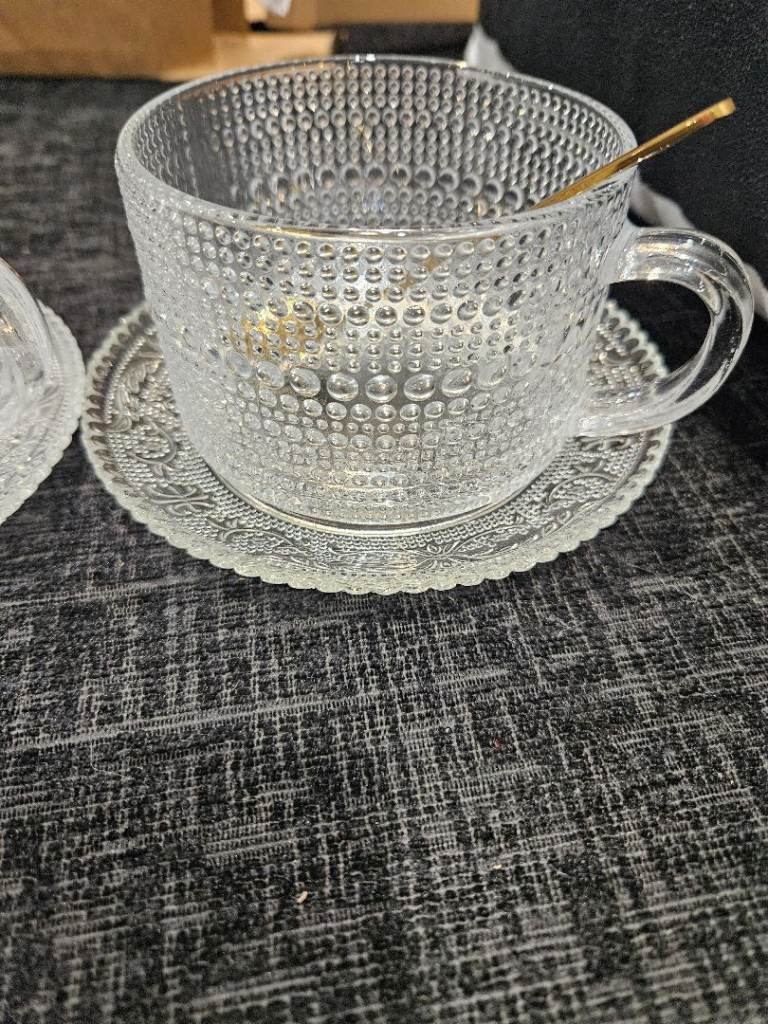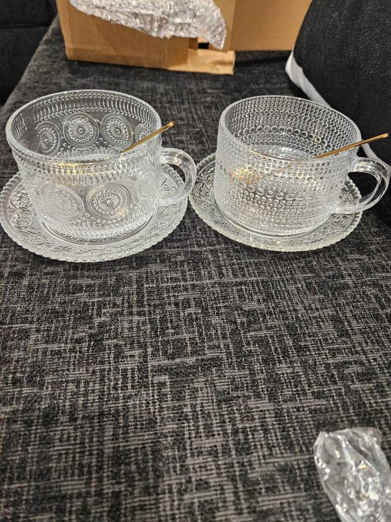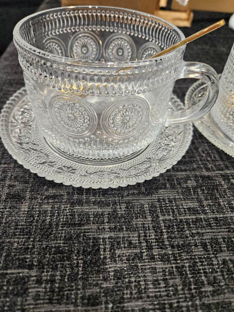 2 vintage style glass cups/mugs with saucers and spoons