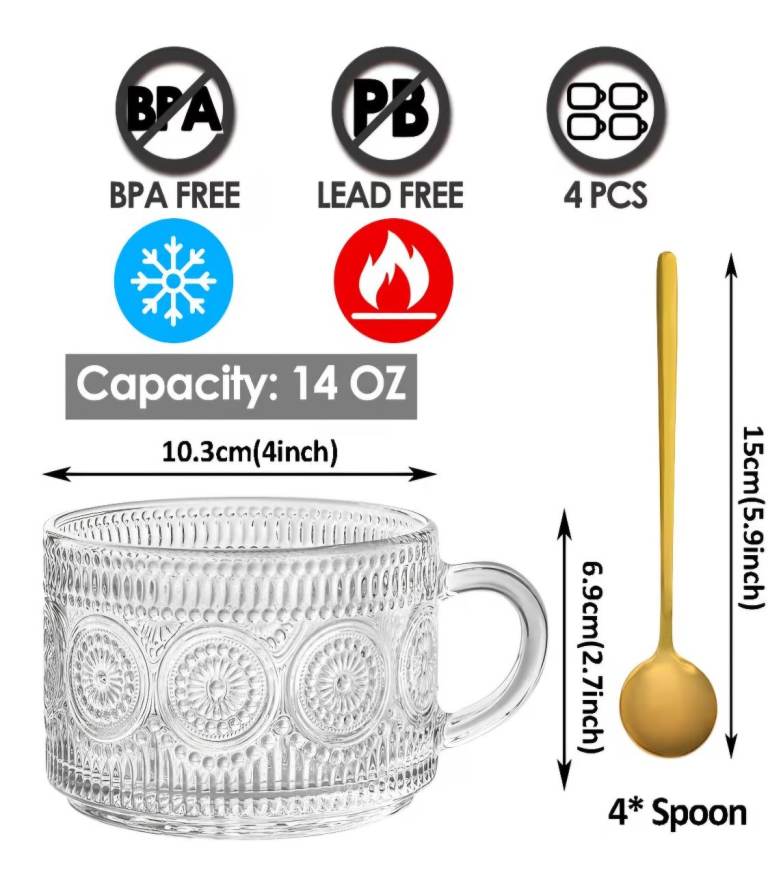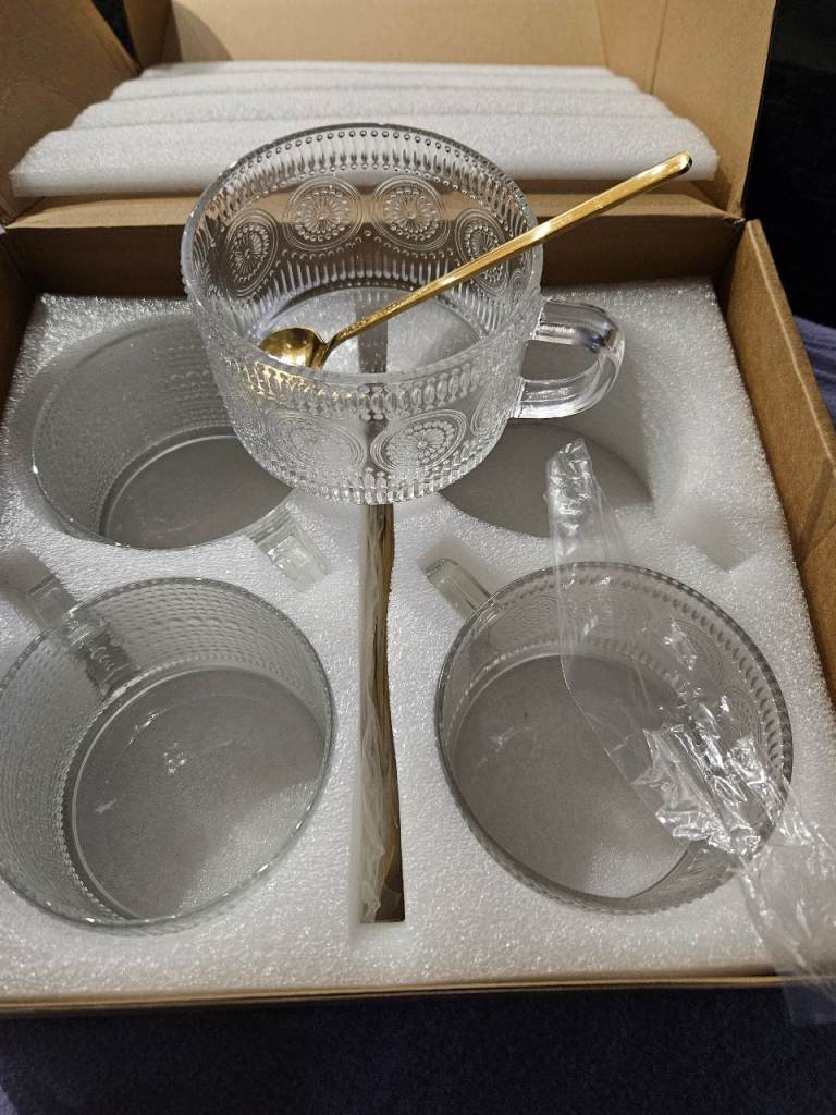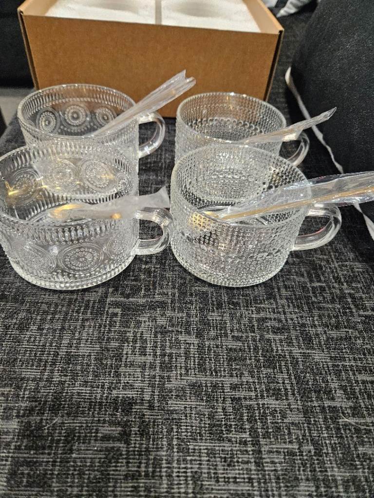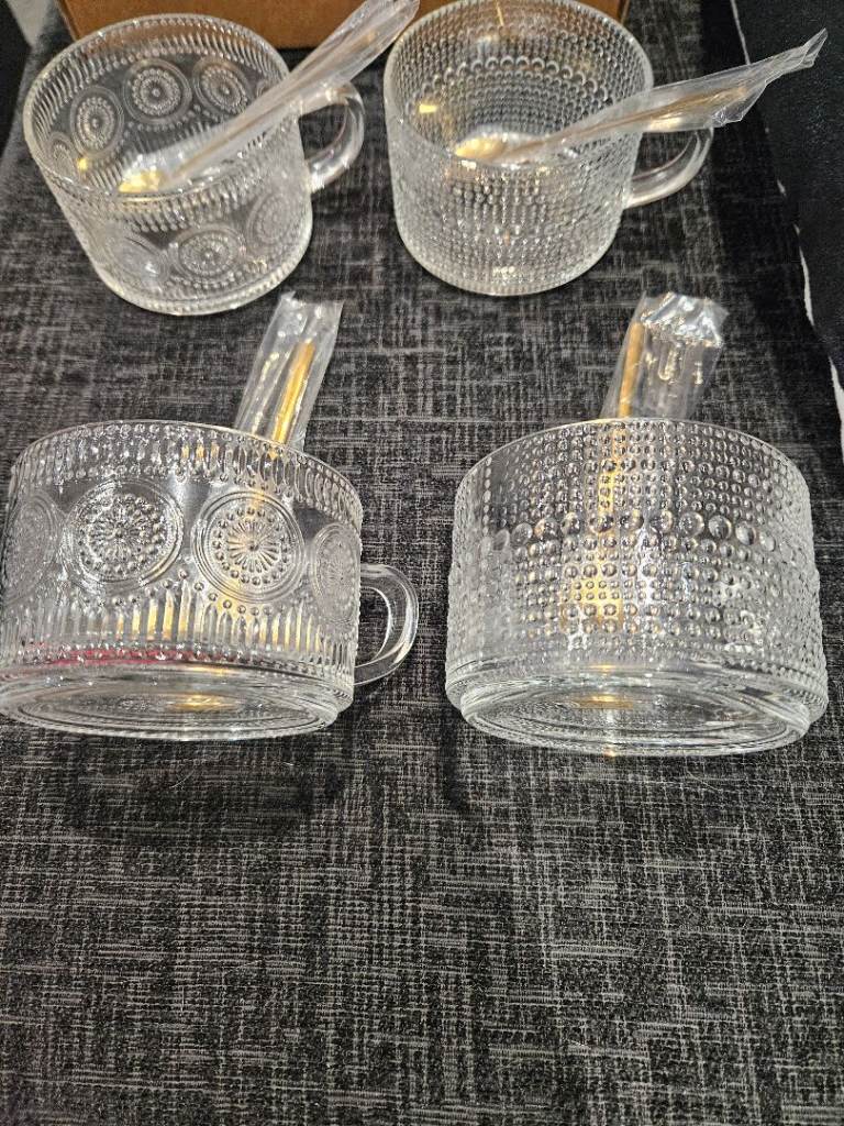 4 vintage style glass cups/mugs with spoons