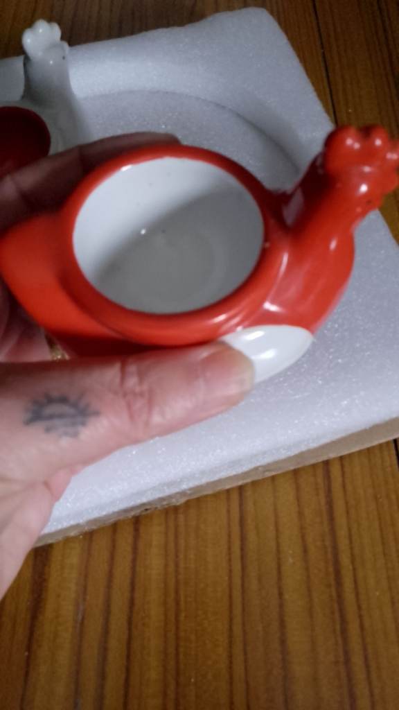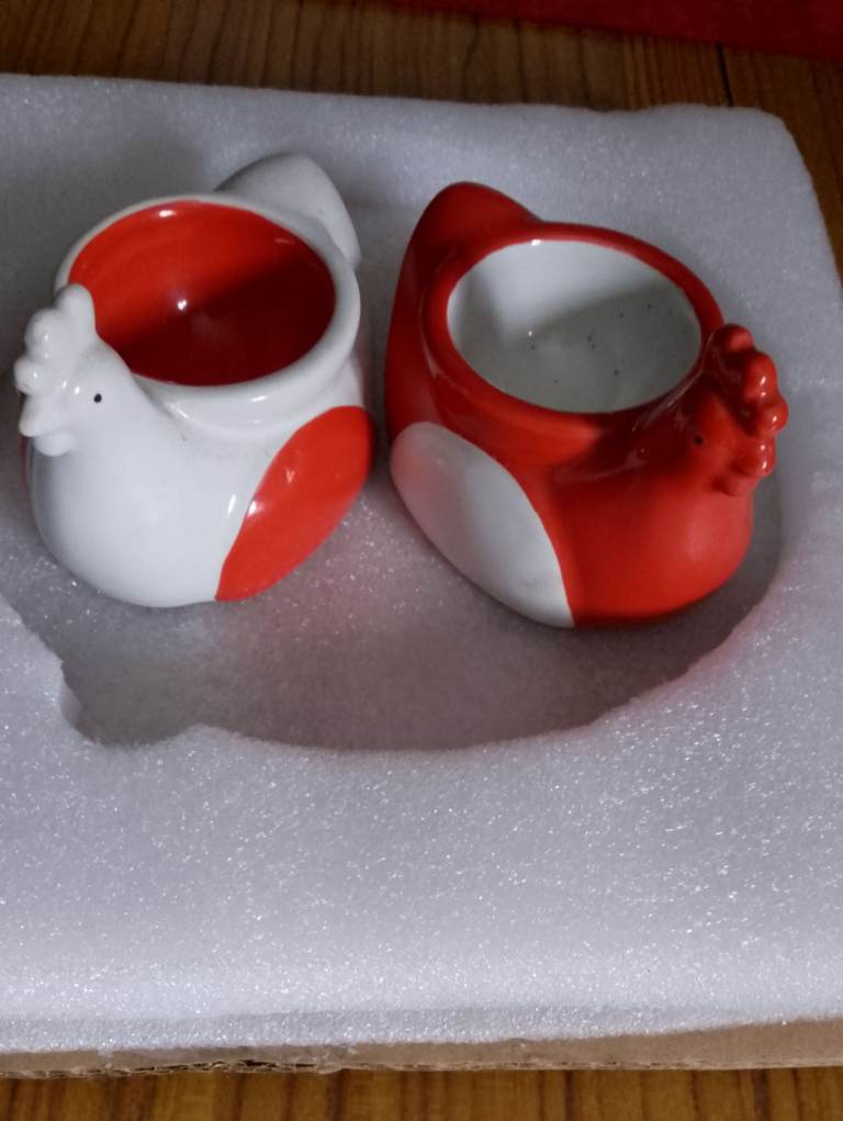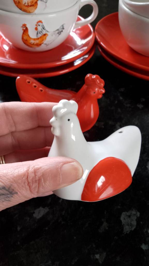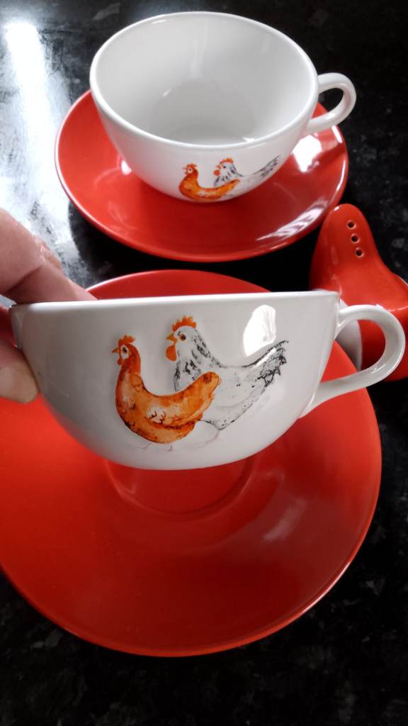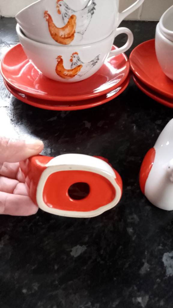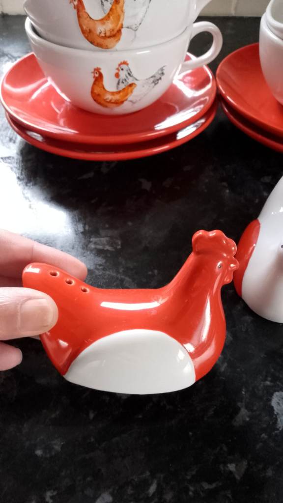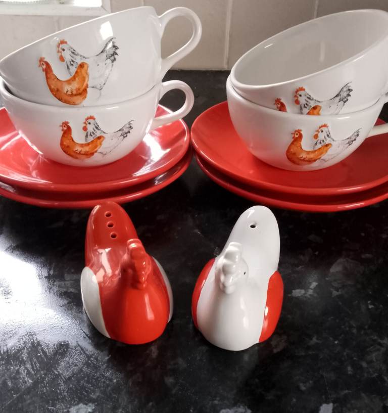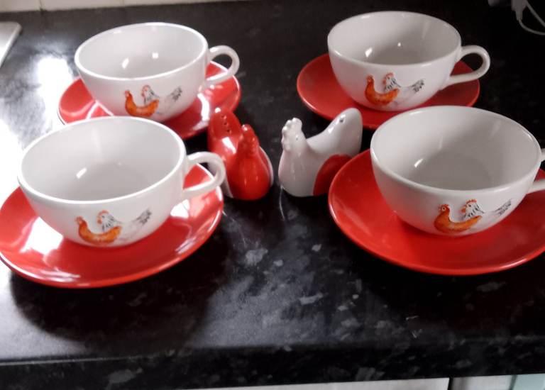 Never used only on display 4 cups an saucers would be ideal for hot chocolate and 2 chicken egg cups & salt and pepper, The salt and pepper don't have the stoppers underneath. No offers