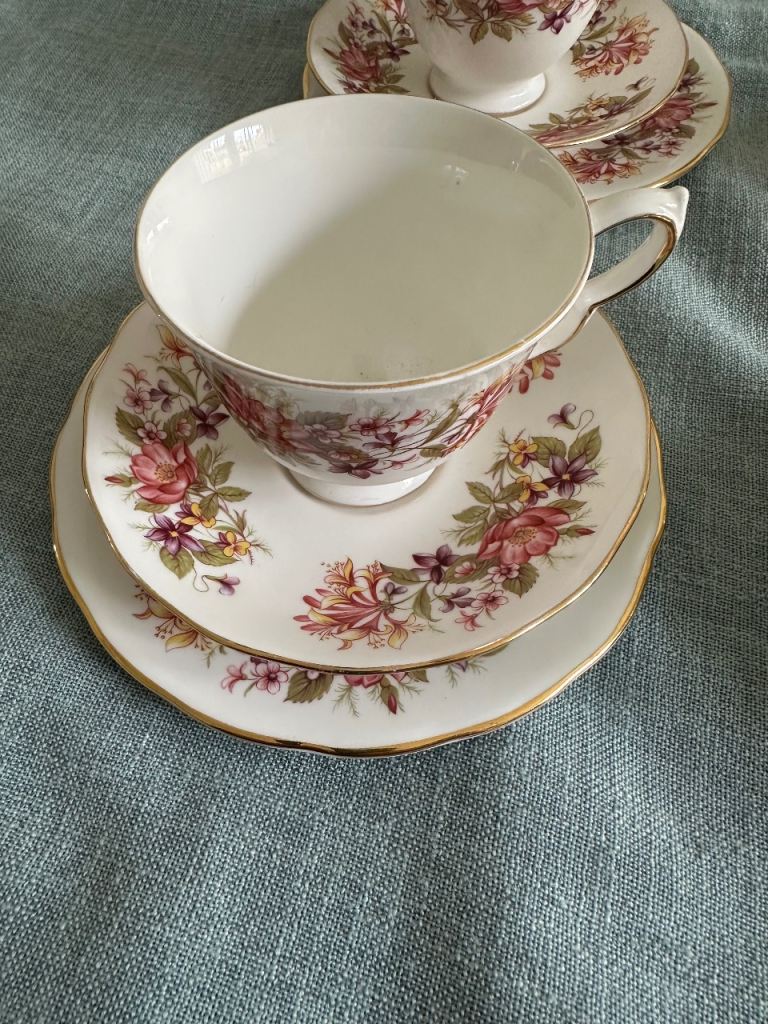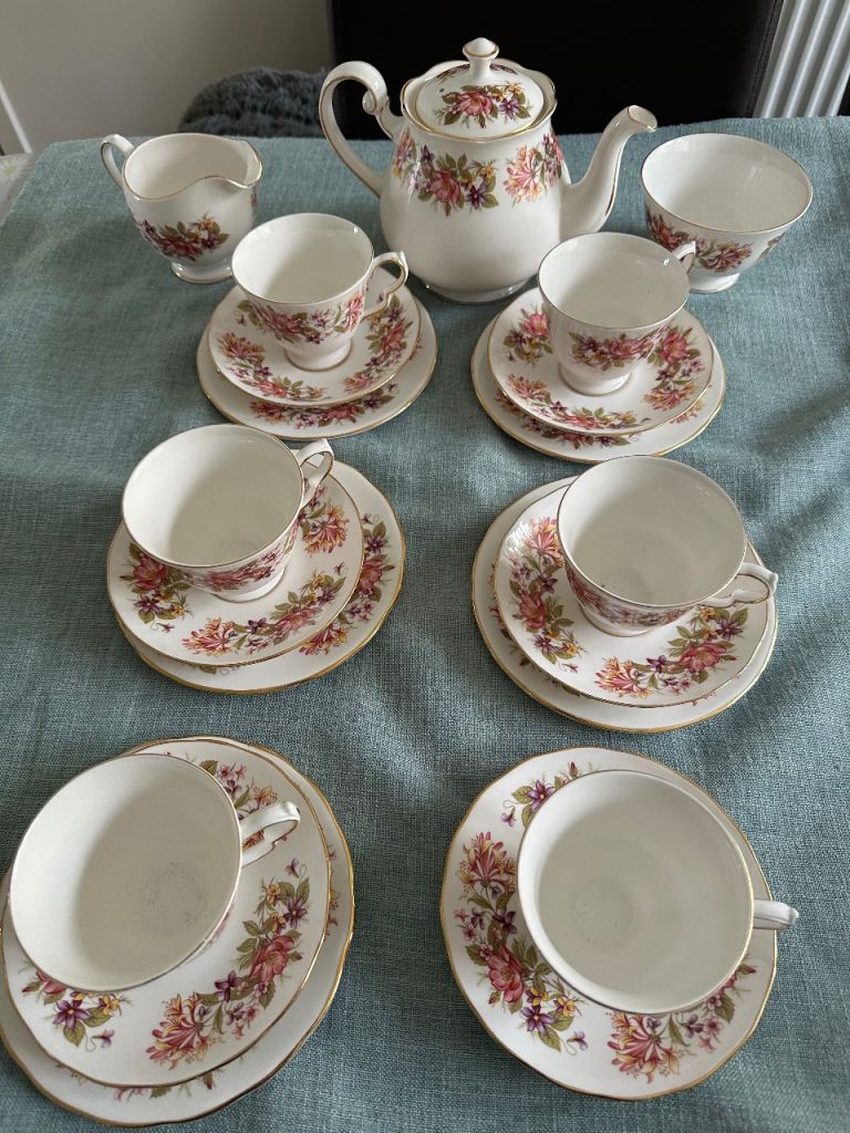 Excellent condition tea set containing 20 pieces for 6 people a side plate is missing but contains tea pot, milk jug and sugar bowl. All are in great condition with no chips or cracks