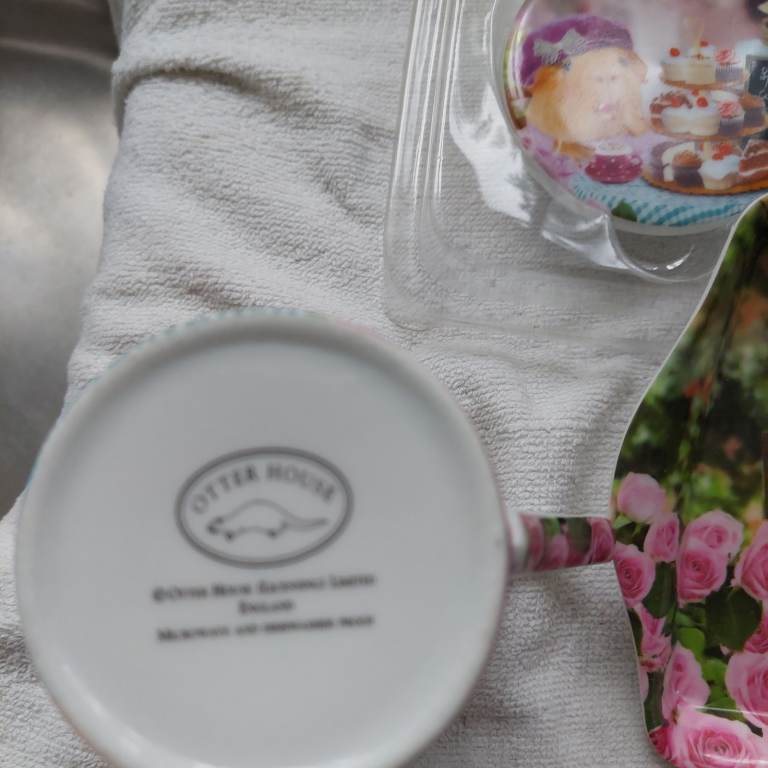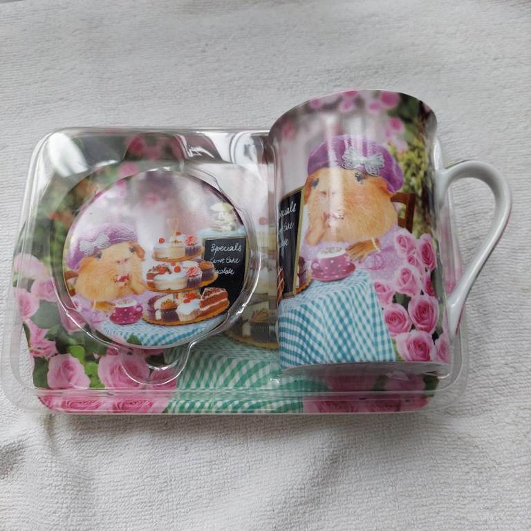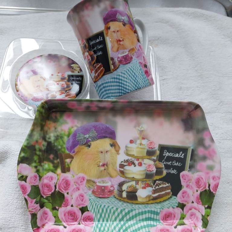 Cup coaster & tray for one never used still on box saying specials carrot cake chocolate cake