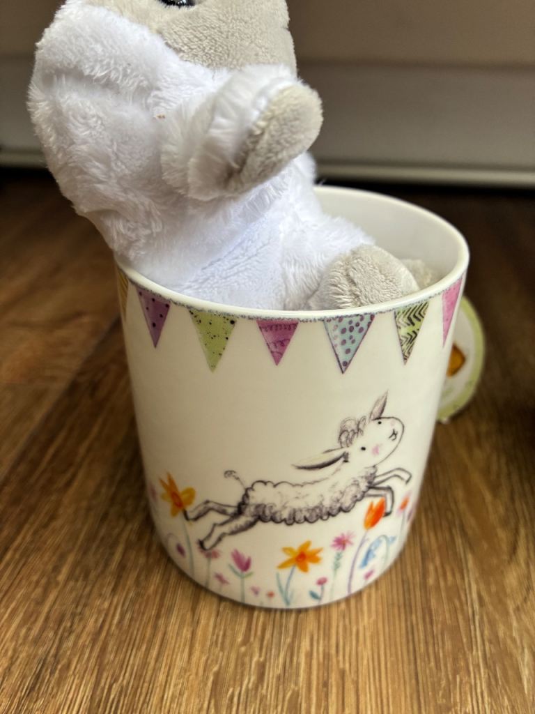 2 mugs are lamb design with cuddly lambs