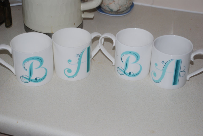 4 i Initialled mugs 2 each of A and B. . Would appeal to those followers of some foreign pop group or those of a sheepish nature. At present these mugs are retailed by Fortnum and Mason for £24-95 each. These are all as new with no chips or cracks. Lovely bone china. A giveaway at £5 each!! Collection only from NR13.