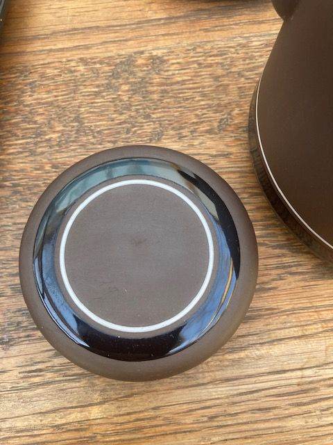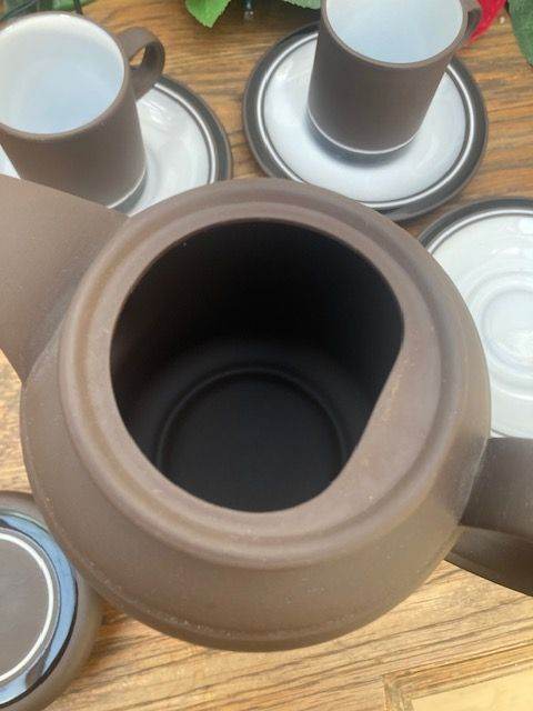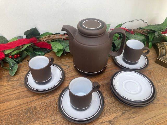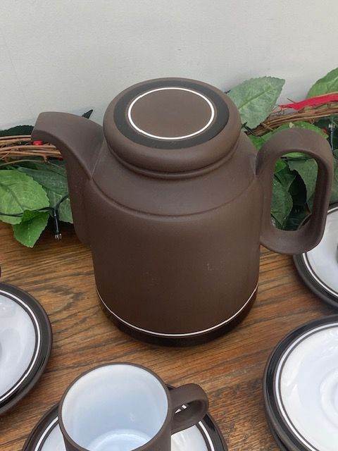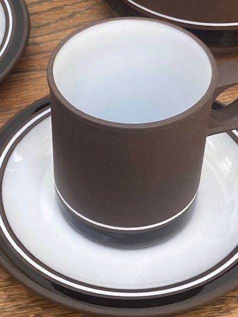 Part Hornsea Pottery Contrast Demitasse Coffee Cups, Saucers and coffee pot from the 1970s. Overall condition good. Hornsea Pottery's "Contrast" (1974–1992) range was a highly successful, award-winning 1970s British tableware designed by Martin Hunt (of Queensberry Hunt). It featured a distinctive, durable "Vitramic" dark chocolate brown body with a glossy black band and white interior. Produced in Lancaster, it won a Design Council Award in 1975.