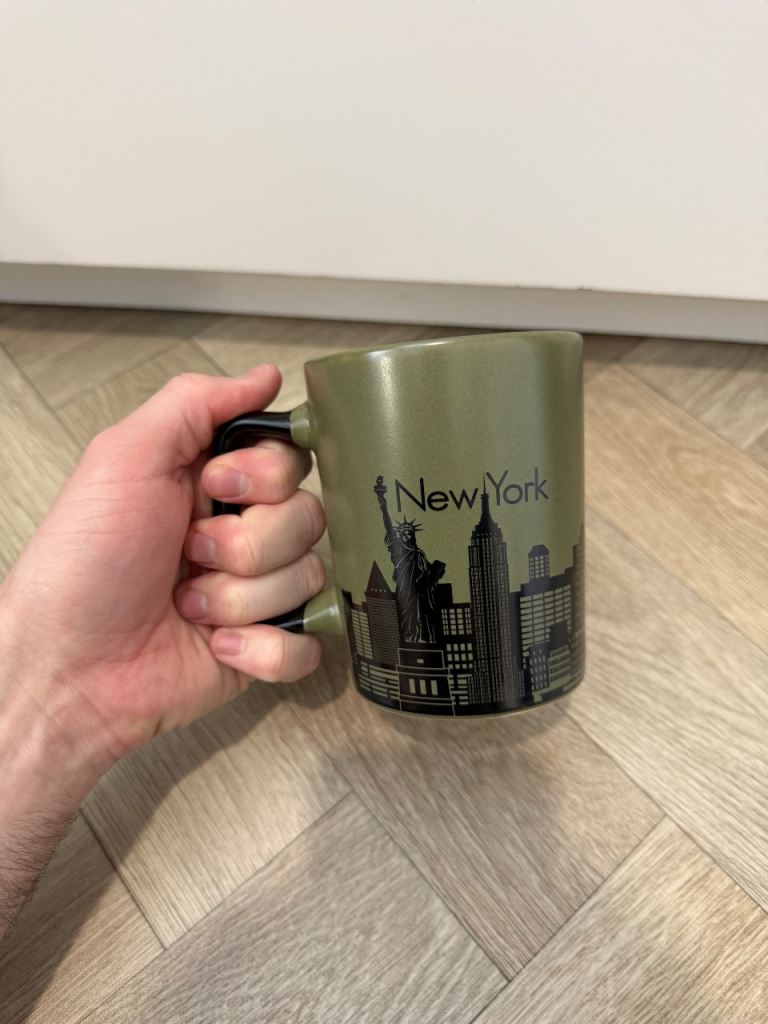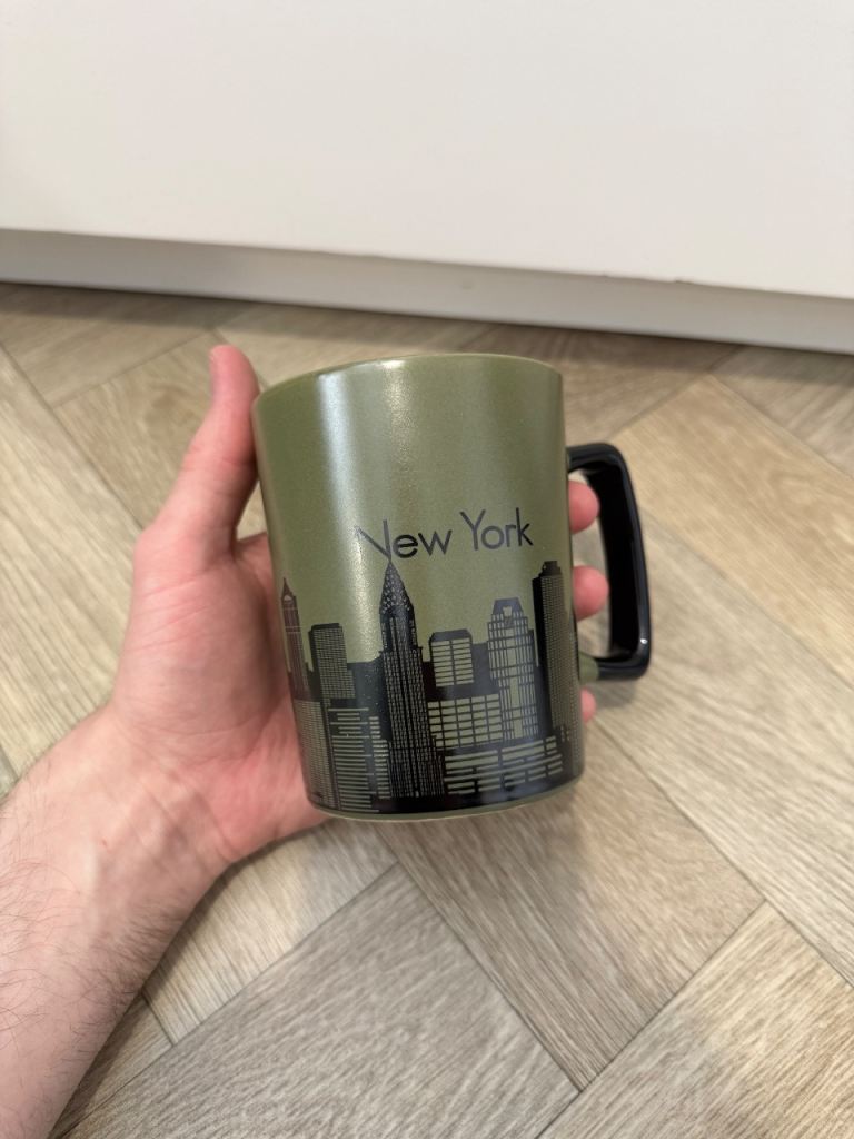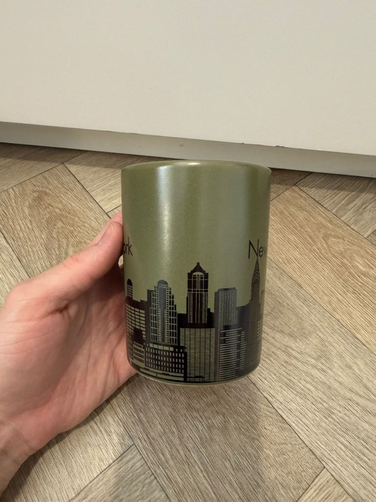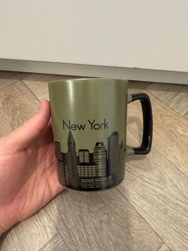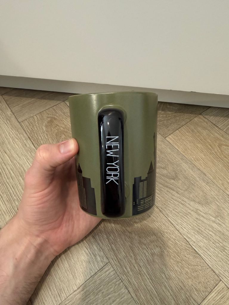 The mug is in like new condition as has only been used a couple times (no staining, etc) and comes in a khaki green colour with black detailing. It features a New York City landscape print all the way round the outer and a strong black handle with New York branding. This was originally purchased from Times Square, New York last year and is approx 12cm in height, only selling due to having a clear out. From a pet and smoke free home.