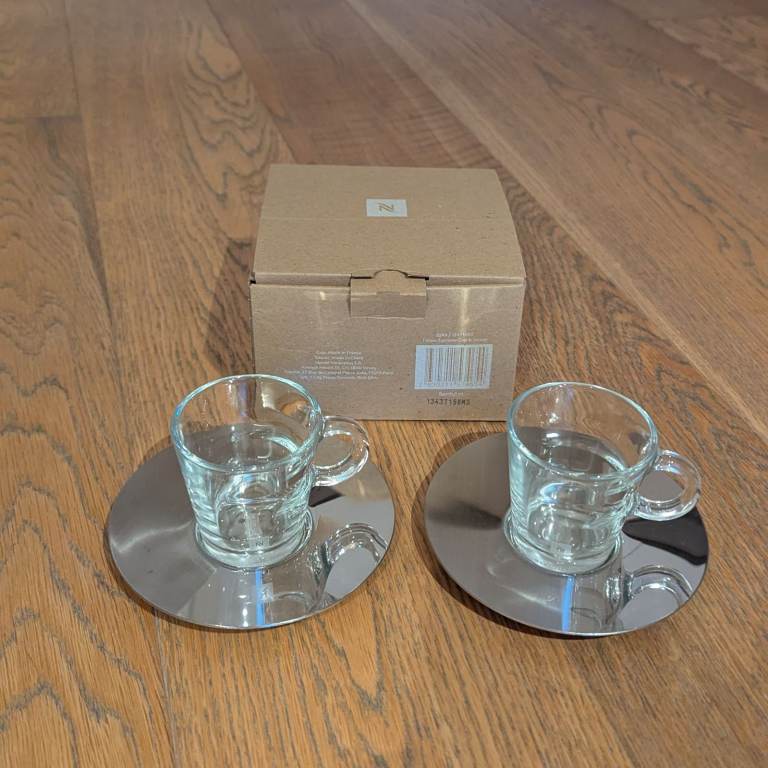 • 2 x NESPRESSO Glass Cups & Metal Saucers – NEW & boxed