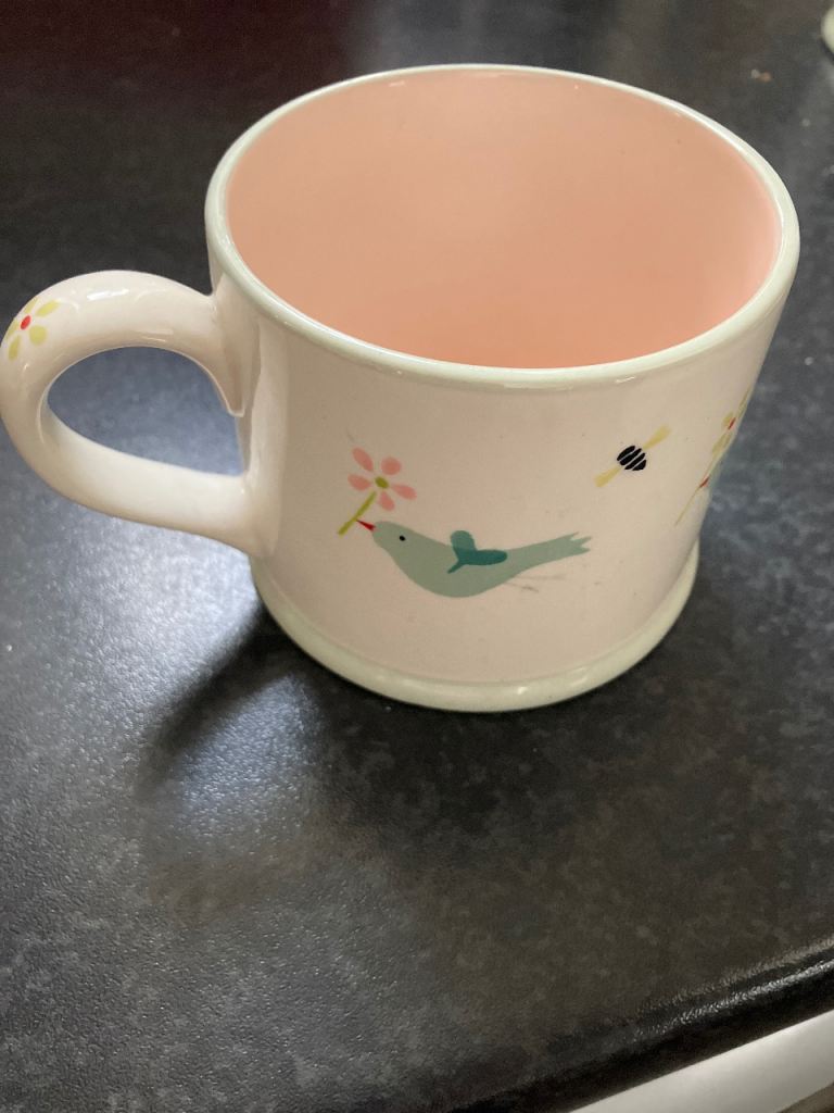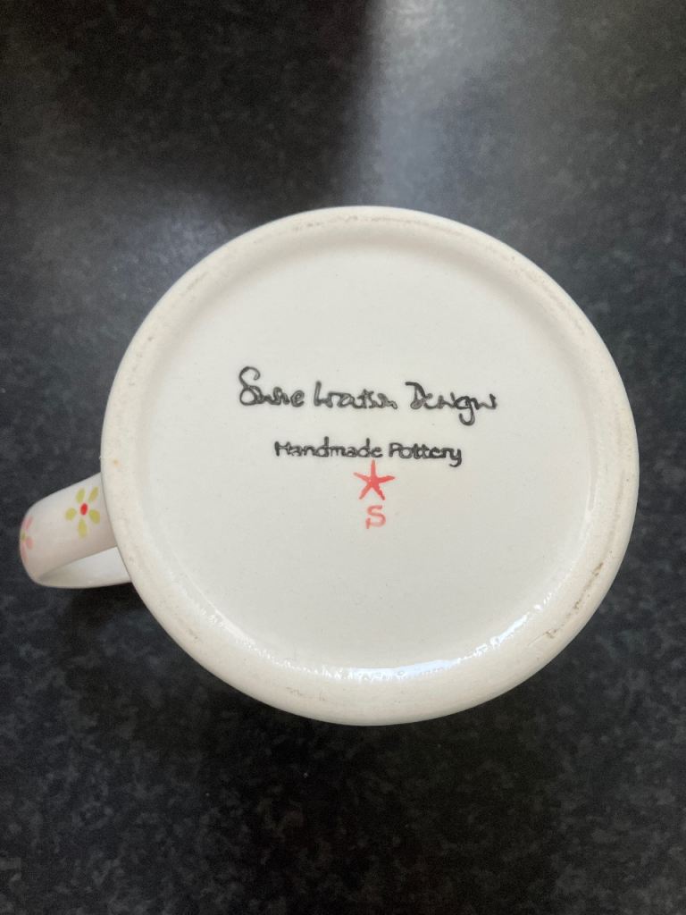 Pair of delightful Hand-painted ‘Susie Watson Designs’ mugs featuring a pattern of birds, bees and flowers.