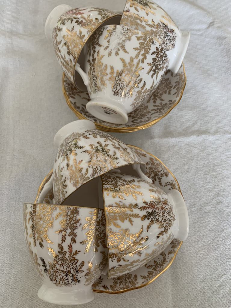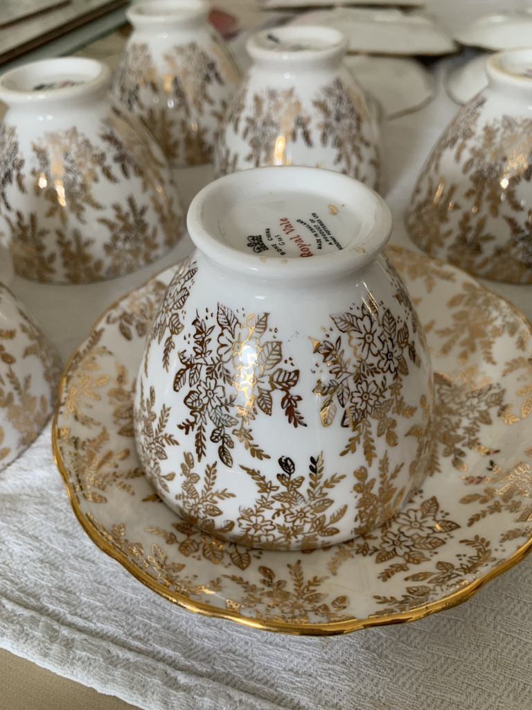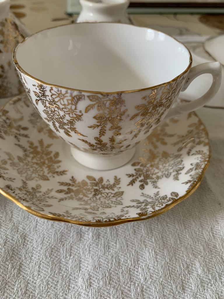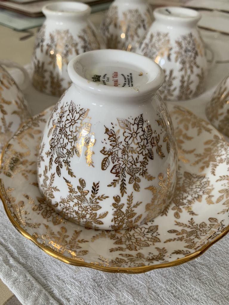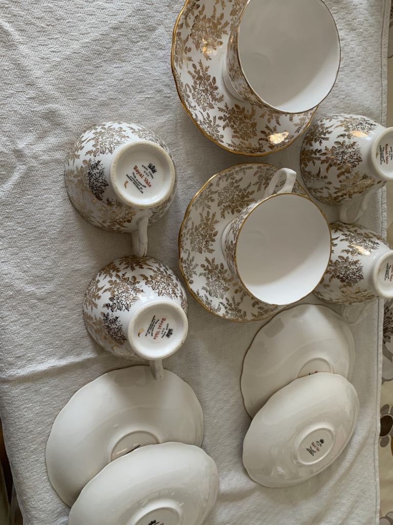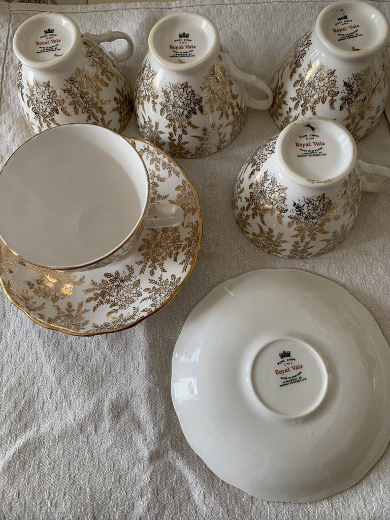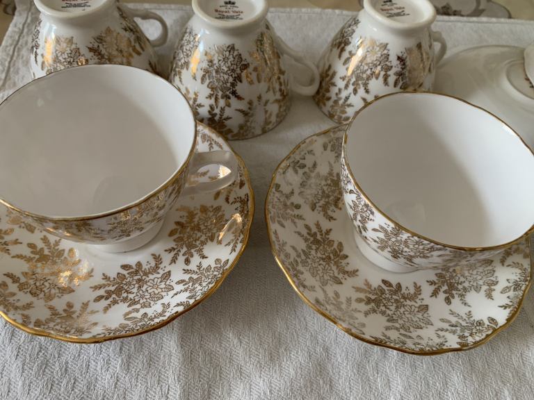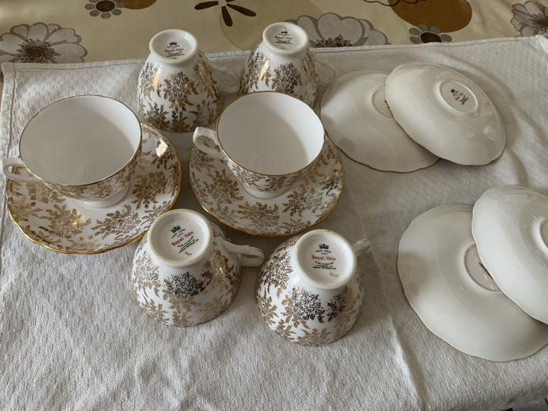 Royal Vale bone china 6 cups and 6 saucers made in England by Ridgeway pottery in very good condition. No chips or cracks, a bit of fading of gold in some places but nothing major. From a smoke and pet free house. No offers. Collection Gorleston, nr316by.