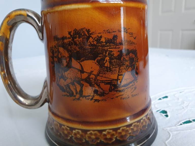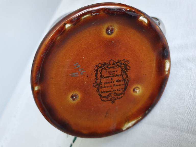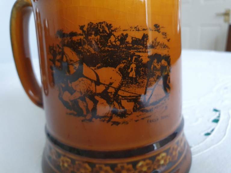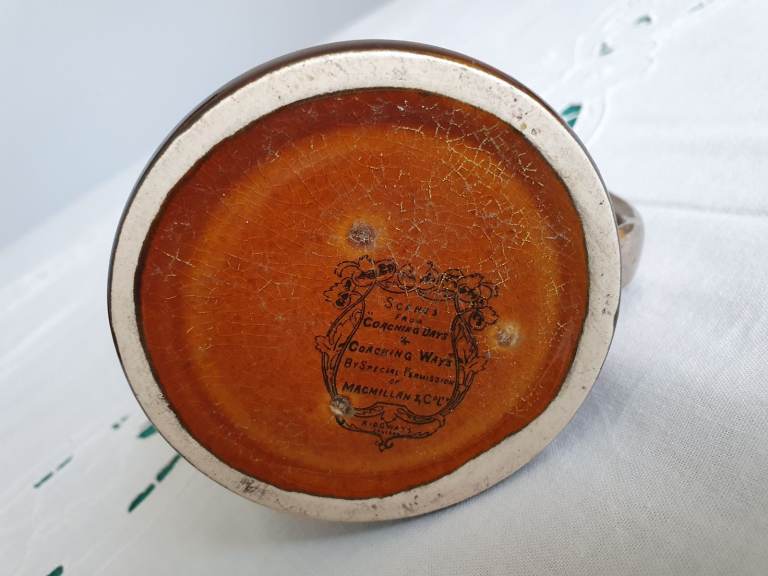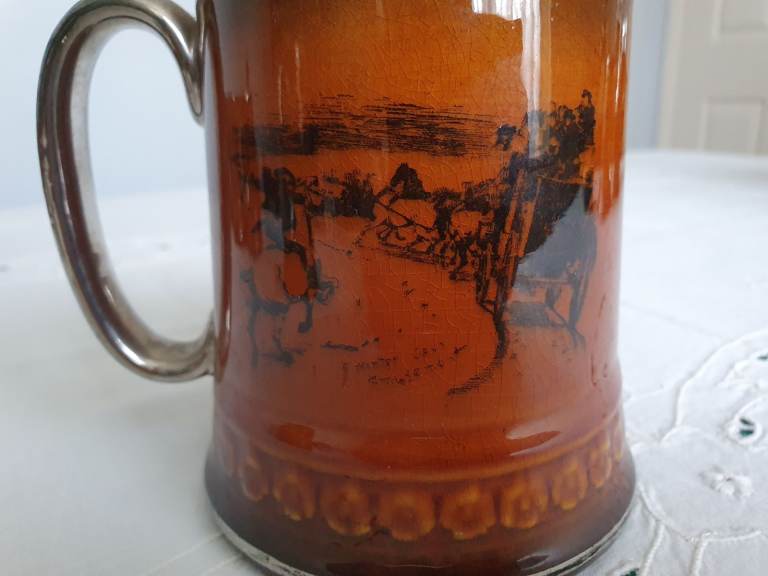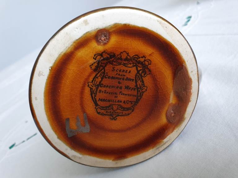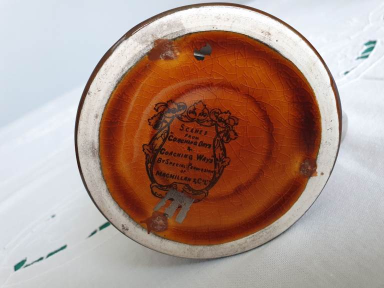 The Coaching Days and Coaching Ways series was created on amber brown transferware pottery with black transfers, produced in the 1890s to the 1920s. The series features illustrations chosen by Hugh Thomson & Herbert Railton, contained in the book “Coaching Days and Coaching Ways” by W. Outram Tristram. The book was first published in 1888.