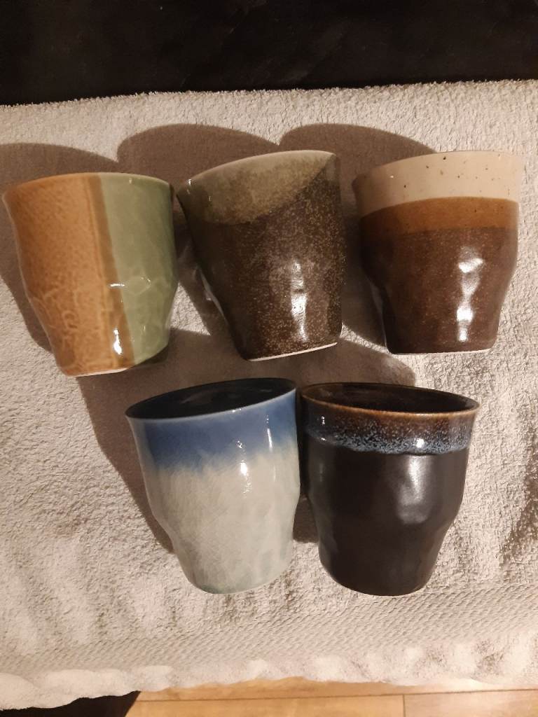 Posting for 12+ yearsset of retro stoneware tumblers x5