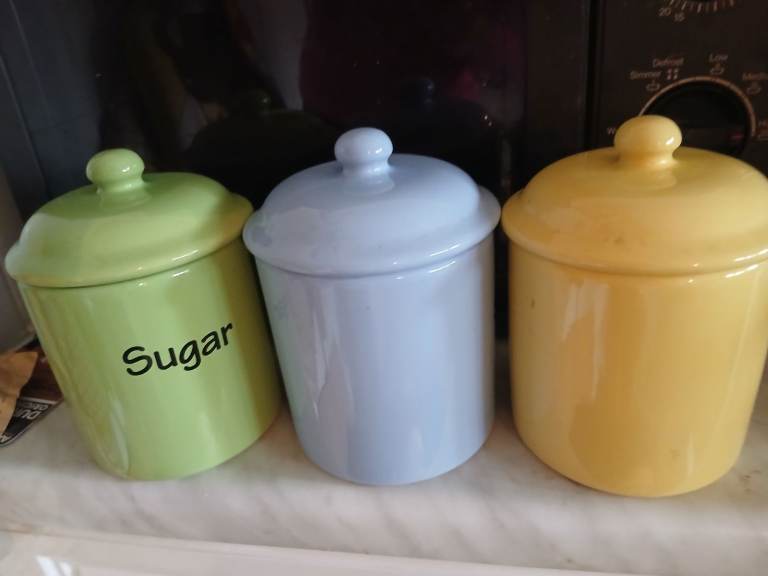 A set of three colourful set of cannisters for sugar tea and coffee.