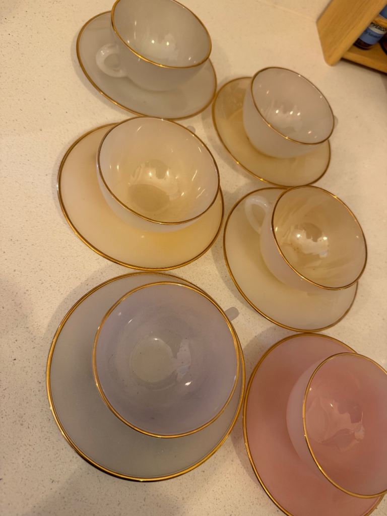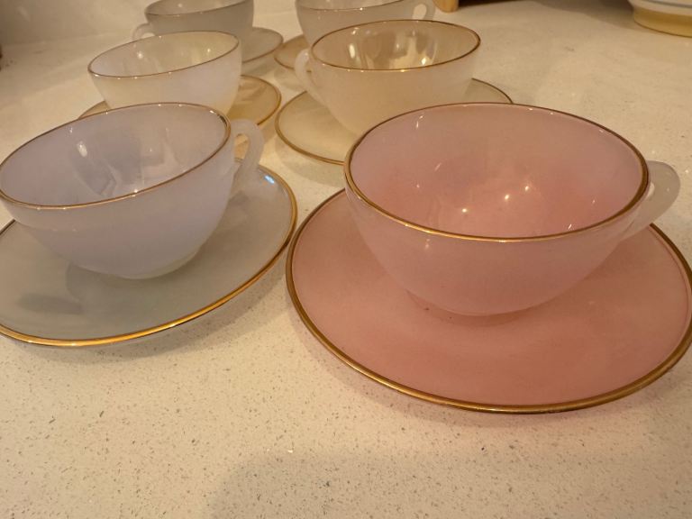 The most beautiful set of Arcopal 6 cups and saucers. At least 65 years old. Never used only ever been on display. The colours are stunning and certainly these photos don’t do them justice.