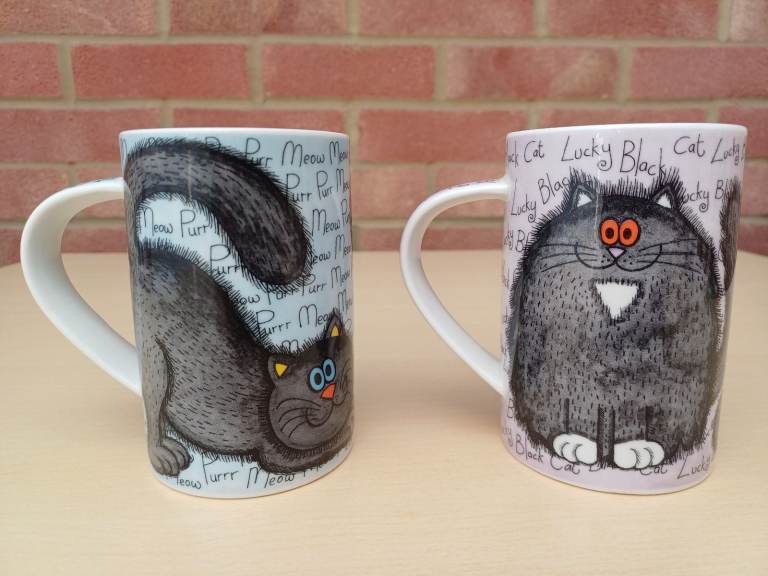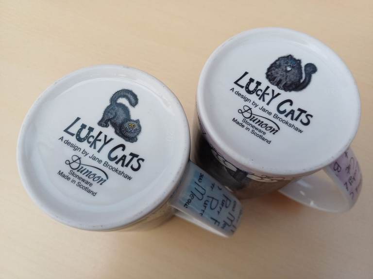 Cute pair of vintage Dunoon Stoneware Lucky Cats mugs designed by Jane Brookshaw. One blue and one pink. Made in Scotland using the highest quality fine bone china. Pristine condition. Kept in storage - never used. Would make a lovely gift for cat lovers or for a collector of all things cats. Collection only.