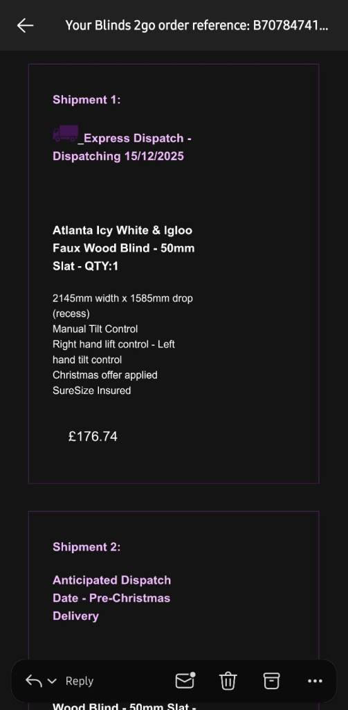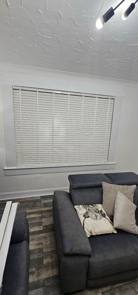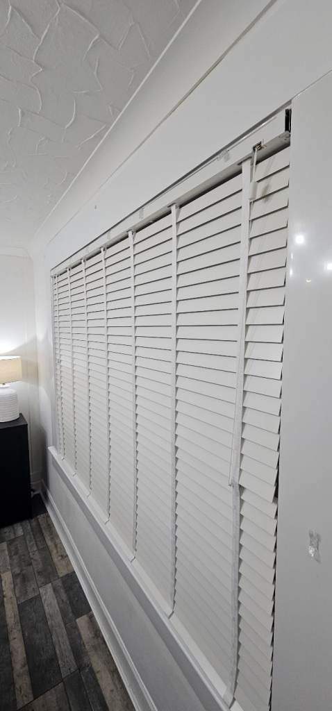 I am selling this recently purchased faux wood blind. Dimensions are : width - 2145mm x drop - 1585mm. I purchased this I read the description and Interpreted it to be ice white. When it arrived it was an off white. I had to reorder another blind of a different colour. This featured blind was ordered on the 12th Dec 25. Delivered and installed 23rd Dec 25. It was taken down and packaged up on 15th Jan 26. Blind was only up for just over 3 weeks. No marks and like new. Original order screen shot shows price paid when purchased. All fixings included. Collect or can deliver locally for a small fee. Not willing to post.