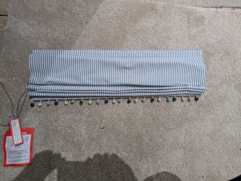 Beautiful roman blinds for 3 windows including bay. Bought from Flair blinds 5 years ago but used only for 2. Cost £1500 but selling at low cost as one of the small blinds has a fixing which was broken on removal, these can be bought online. To fit internal window sizes of; 97 x 144 there are two of these, the bay blinds measure 102 x 144 and two side panels are 44 x 144 cms.