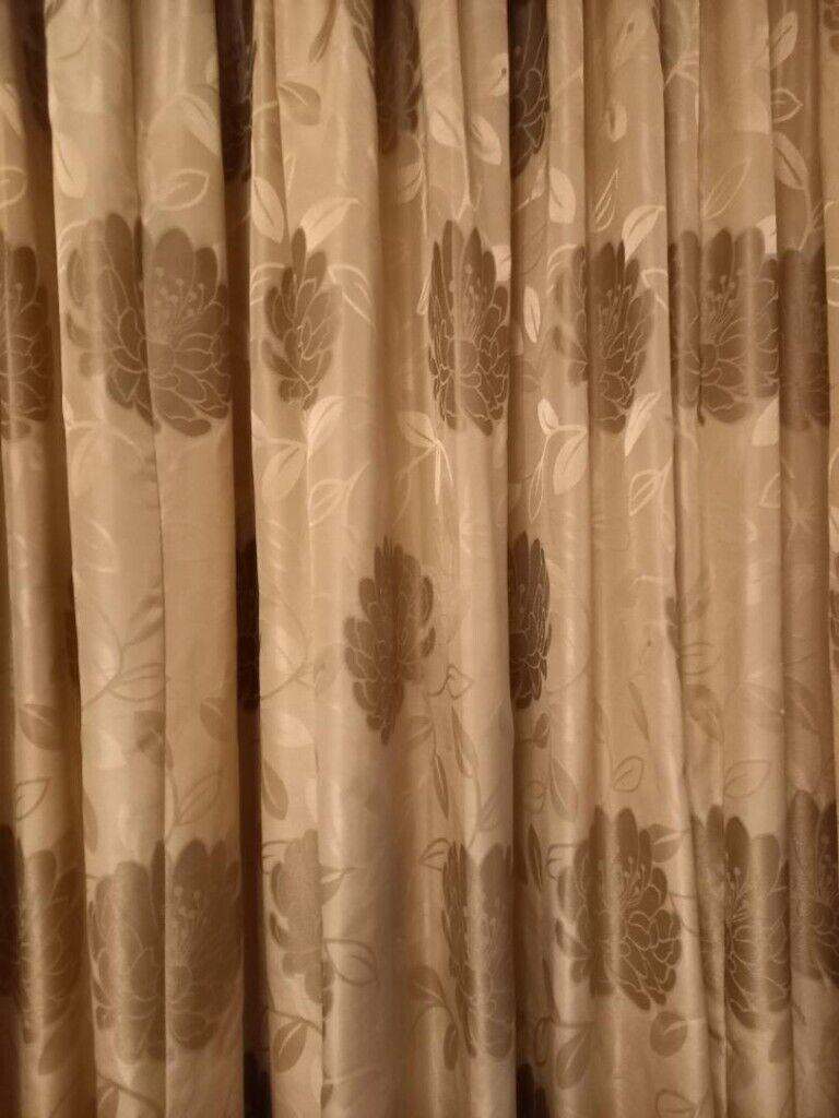These two pairs (4 pieces) of British made to measure curtains are made of high quality heavy material and are lined with a heavy cream coloured material. They keep out the light and the cold from the windows in the winter. The curtain in the window(pictured) is higher and has a longer drop. Each section is approximately 410cm in width and 250cm in drop. The second pair covering the lower doorway has a shorter drop of 210cm. Each pair of curtains come with a Valance and the extendable metal curtain track.