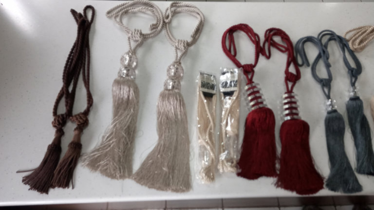 Black corded tie back with glass disc and tassel, length about 70 cm. Never been used, still has tag on, original price £10. Collection only.